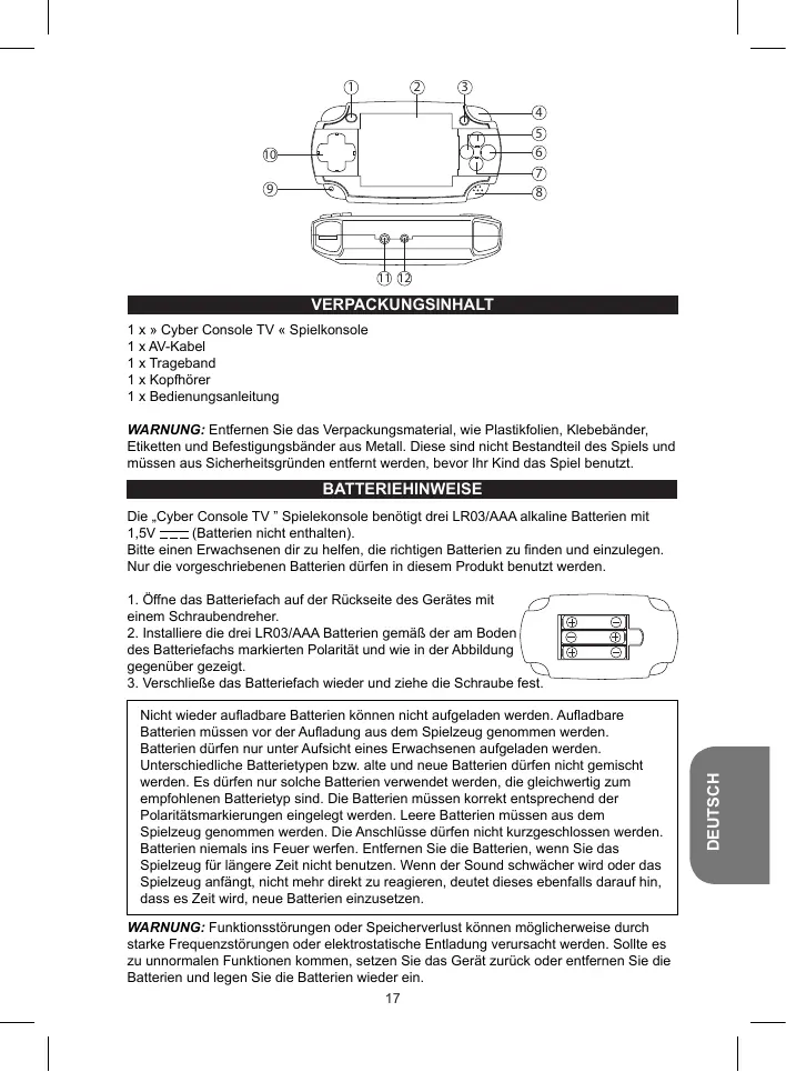 Die „Cyber Console TV ” Spielekonsole benötigt drei LR03/AAA alkaline Batterien mit 1,5V (Batterien nicht enthalten). Bitte einen Erwachsenen dir zu helfen, die richtigen Batterien zu finden und einzulegen. Nur die vorgeschriebenen Batterien dürfen in diesem Produkt benutzt werden. Nicht wieder aufladbare Batterien können nicht aufgeladen werden. Aufladbare Batterien müssen vor der Aufladung aus dem Spielzeug genommen werden. Batterien dürfen nur unter Aufsicht eines Erwachsenen aufgeladen werden. Unterschiedliche Batterietypen bzw. alte und neue Batterien dürfen nicht gemischt werden. Es dürfen nur solche Batterien verwendet werden, die gleichwertig zum empfohlenen Batterietyp sind. Die Batterien müssen korrekt entsprechend der Polaritätsmarkierungen eingelegt werden. Leere Batterien müssen aus dem Spielzeug genommen werden. Die Anschlüsse dürfen nicht kurzgeschlossen werden. Batterien niemals ins Feuer werfen. Entfernen Sie die Batterien, wenn Sie das Spielzeug für längere Zeit nicht benutzen. Wenn der Sound schwächer wird oder das Spielzeug anfängt, nicht mehr direkt zu reagieren, deutet dieses ebenfalls darauf hin, dass es Zeit wird, neue Batterien einzusetzen. WARNUNG: Funktionsstörungen oder Speicherverlust können möglicherweise durch starke Frequenzstörungen oder elektrostatische Entladung verursacht werden. Sollte es zu unnormalen Funktionen kommen, setzen Sie das Gerät zurück oder entfernen Sie die Batterien und legen Sie die Batterien wieder ein.