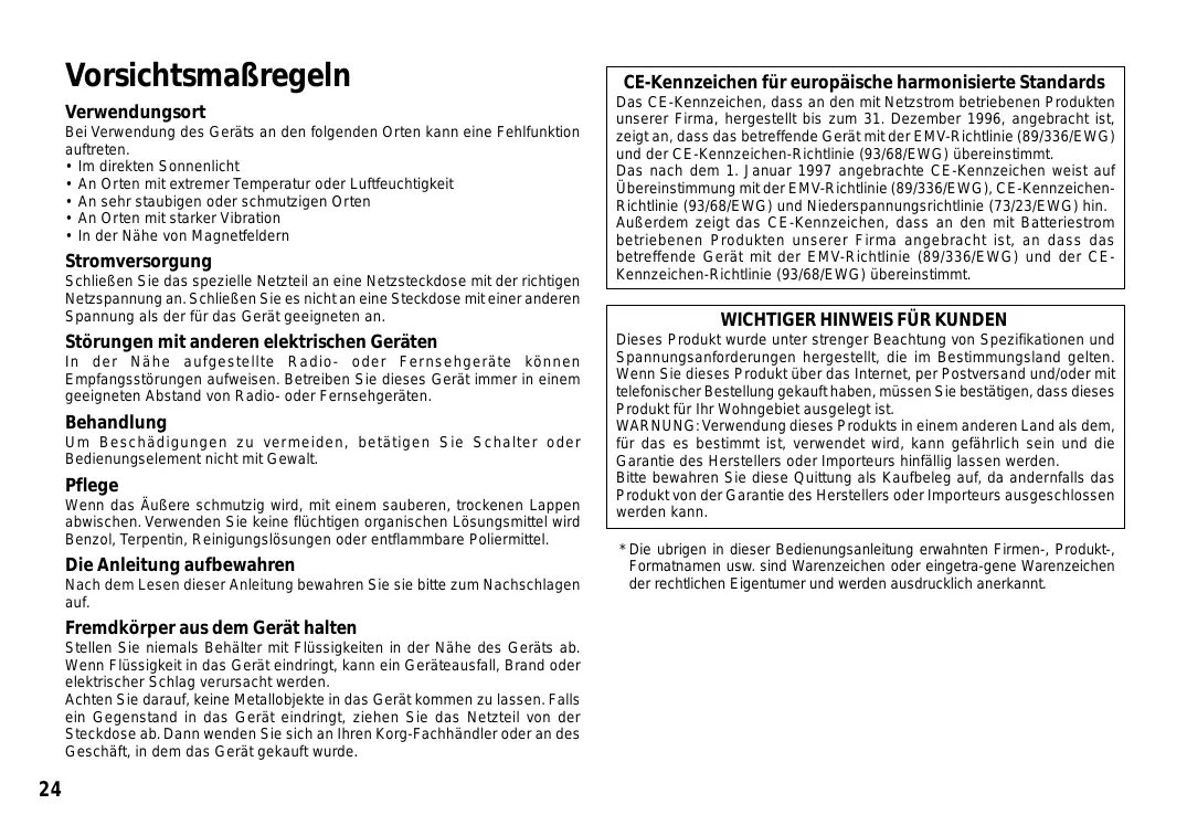 Das CE-Kennzeichen, dass an den mit Netzstrom betriebenen Produkten unserer Firma, hergestellt bis zum 31. Dezember 1996, angebracht ist, zeigt an, dass das betreffende Gerät mit der EMV-Richtlinie (89/336/EWG) und der CE-Kennzeichen-Richtlinie (93/68/EWG) übereinstimmt.