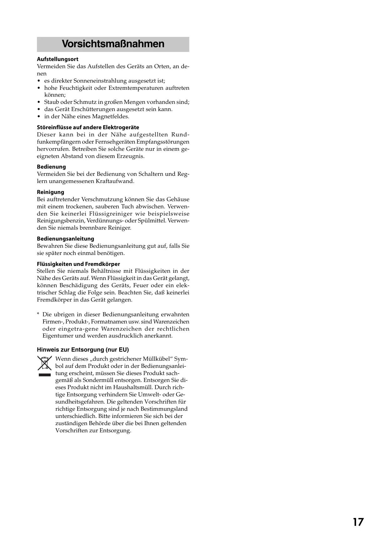 Stellen Sie niemals Behältnisse mit Flüssigkeiten in der Höhe des Geräts auf. Wenn Flüssigkeit in das Gerät gelamt, können Beschädigung des Geräts, Feuer oder ein elektrischer Schlag die Folge sein. Beachten Sie, daß keinerlei Fremdkörper in das Gerät gelangen.