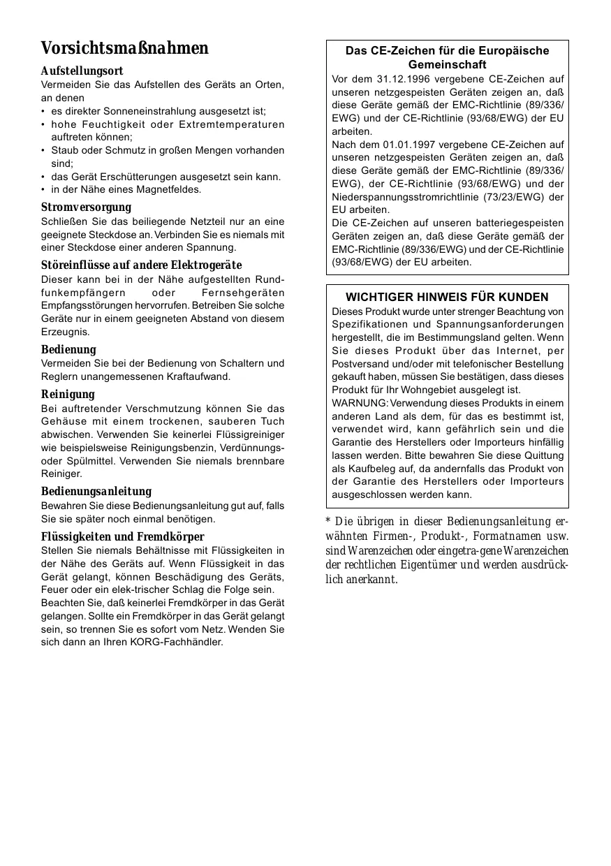 Stellen Sie niemals Behältnisse mit Flüssigkeiten in der Höhe des Geräts auf. Wenn Flüssigkeit in das Gerät gelangt, konnen Beschädigung des Geräts, Feuer oder ein elektrischer Schlag die Folge sein. Beachten Sie, daß keinerlei Fremdkörper in das Gerät gelangen. Sollet ein Fremdkörper in das Gerät gelangt sein, so trennen Sie es sofort vom Netz. Wenden Sie sich dann an ihren KORG-Fachhandler.
