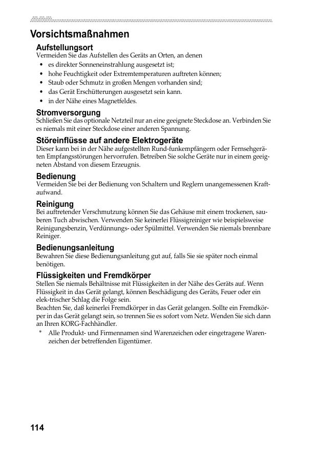 Flüssigkeiten und Fremdkörper Stellen Sie niemals Behältnisse mit Flüssigkeiten in der Nähe des Geräts auf. Wenn Flüssigkeit in das Gerät gelangt, können Beschädigung des Geräts, Feuer oder ein elek‐trischer Schlag die Folge sein. Beachten Sie, daß keinerlei Fremdkörper in das Gerät gelangen. Sollte ein Fremdkör‐ per in das Gerät gelangt sein, so trennen Sie es sofort vom Netz. Wenden Sie sich dann an Ihren KORG‐Fachhändler. * Alle Produkt‐ und Firmennamen sind Warenzeichen oder eingetragene Waren‐ zeichen der betreffenden Eigentümer.