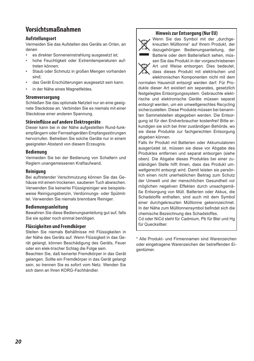 Beachten Sie, daß keinerlei Fremdkörper in das Gerät gelangen. Sollte ein Fremdkörper in das Gerät gelamt sein, so trennen Sie es(sofort vom Netz.Wenden Sie sich dann an ihren KORG-Fachhändler.