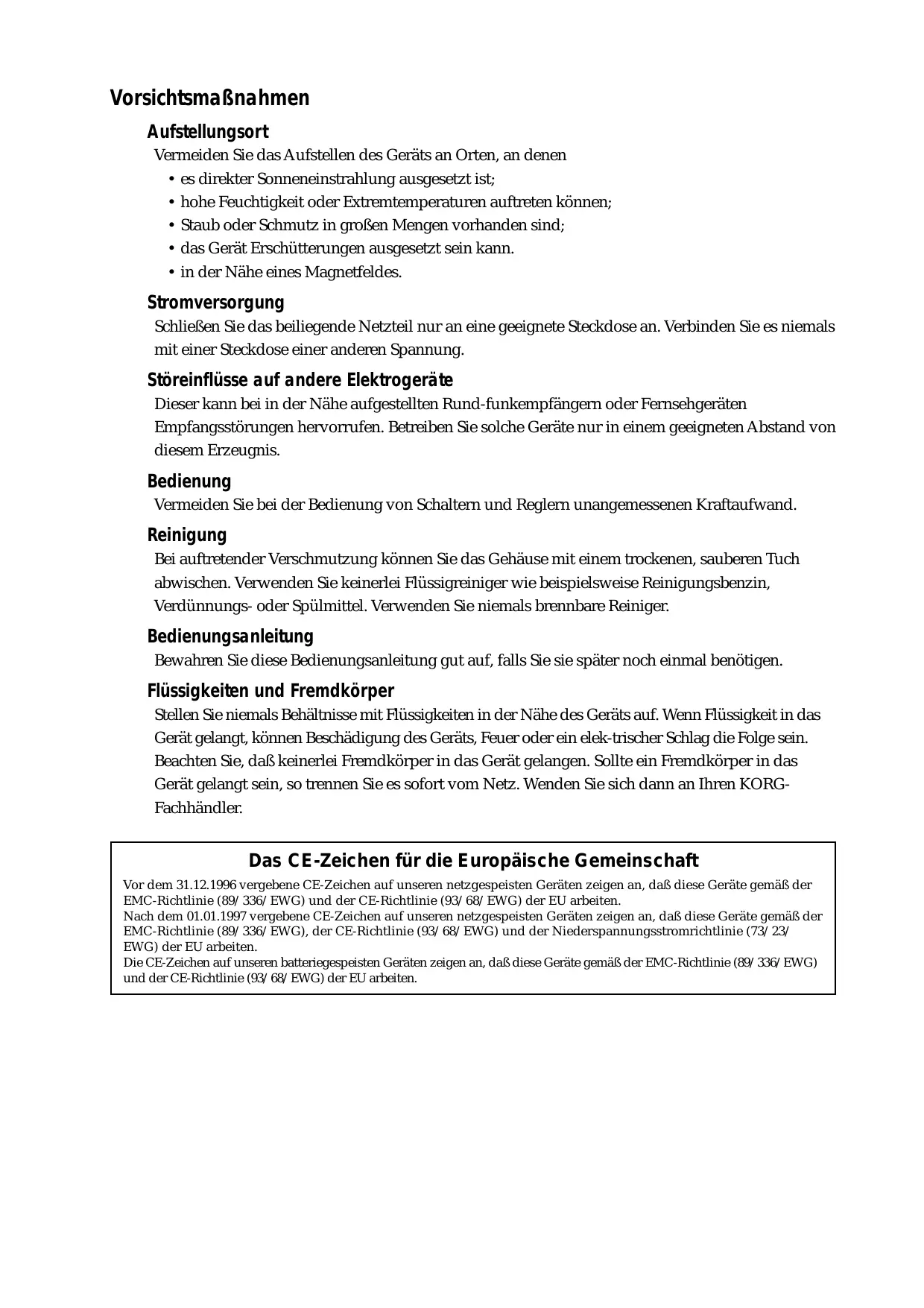 Flüssigkeiten und Fremdkörper Stellen Sie niemals Behältnisse mit Flüssigkeiten in der Nähe des Geräts auf. Wenn Flüssigkeit in das Gerät gelangt, können Beschädigung des Geräts, Feuer oder ein elek-trischer Schlag die Folge sein. Beachten Sie, daß keinerlei Fremdkörper in das Gerät gelangen. Sollte ein Fremdkörper in das Gerät gelangt sein, so trennen Sie es sofort vom Netz. Wenden Sie sich dann an Ihren KORGFachhändler.