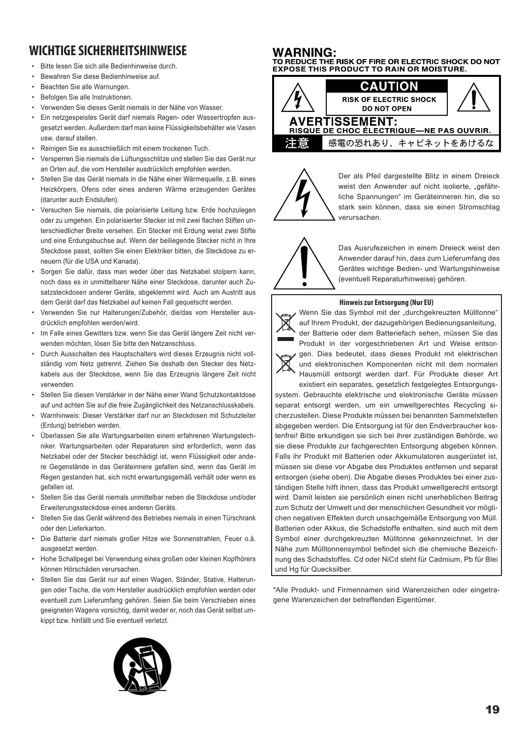 - Stellen Sie das Gerät nur auf einen Wagen, Ständer, Stative, Halterungen oder Tische, die vom Hersteller ausdrücklich empfohlen werden oder eventuell zum Lieferumfang gehören. Seien Sie beim Verschieben eines geeigneten Wagens vorsichtig, damit weder er, noch das Gerät selbst umkippt bzw. hinfält und Sie eventuell verletzt.