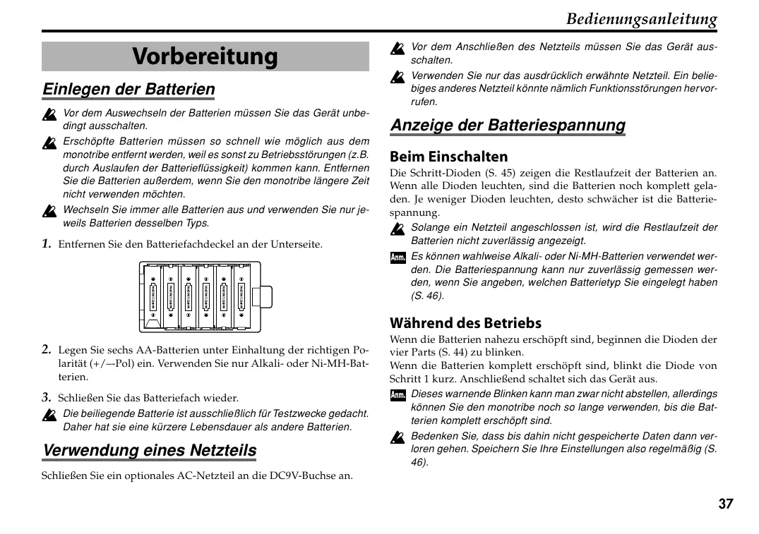 Si les piles sont complètement épuisées, le témoin numéroté 1 clignote puis l’alimentation de l’appareil est coupée. Il est impossible d’arrêter les signaux vous avertissant que les piles sont presque épuisées mais vous pouvez continuer à utiliser le monotribe jusqu’à épuisement complet. Les données non sauvegardées sont perdues. Sauvegardez donc vos données si nécessaire (p.31).