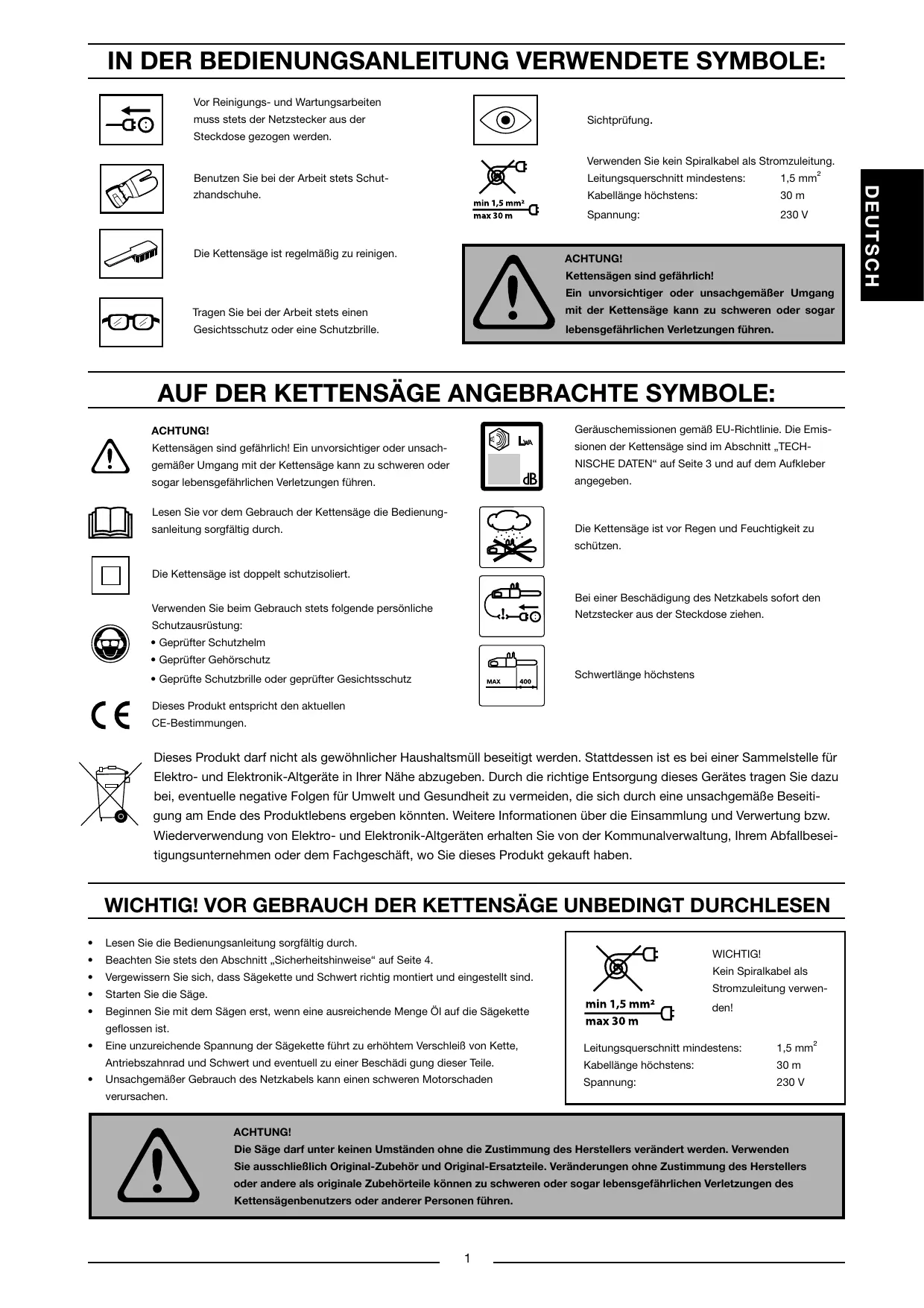 ! AVANT TOUTE UTILISATION DE LA TRONÇONNEUSE, page 1.