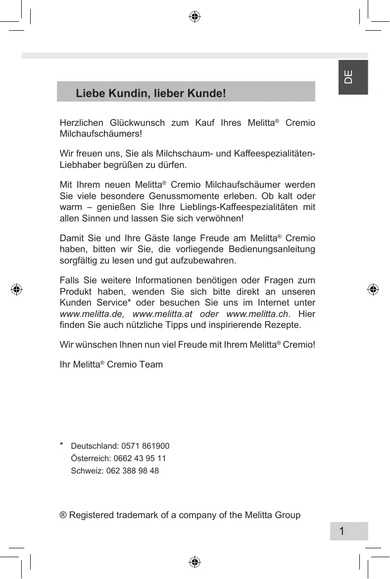 D DE Liebe Kundin, lieber Kunde! Herzlichen Glückwunsch zum Kauf Ihres Melitta® Cremio Milchaufschäumers! Wir freuen uns, Sie als Milchschaum- und KaffeespezialitätenLiebhaber begrüßen zu dürfen. Mit Ihrem neuen Melitta® Cremio Milchaufschäumer werden Sie viele besondere Genussmomente erleben. Ob kalt oder warm – genießen Sie Ihre Lieblings-Kaffeespezialitäten mit allen Sinnen und lassen Sie sich verwöhnen! Damit Sie und Ihre Gäste lange Freude am Melitta® Cremio haben, bitten wir Sie, die vorliegende Bedienungsanleitung sorgfältig zu lesen und gut aufzubewahren. Falls Sie weitere Informationen benötigen oder Fragen zum Produkt haben, wenden Sie sich bitte direkt an unseren Kunden Service* oder besuchen Sie uns im Internet unter www.melitta.de, www.melitta.at oder www.melitta.ch. Hier finden Sie auch nützliche Tipps und inspirierende Rezepte. Wir wünschen Ihnen nun viel Freude mit Ihrem Melitta® Cremio! Ihr Melitta® Cremio Team
