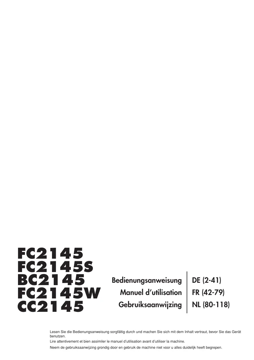 FC2145 FC2145S BC2145 FC2145W CC2145 Bedienungsanweisung DE (2-41) Manuel d’utilisation FR (42-79) Gebruiksaanwijzing NL (80-118) Lesen Sie die Bedienungsanweisung sorgfältig durch und machen Sie sich mit dem Inhalt vertraut, bevor Sie das Gerät benutzen. Lire attentivement et bien assimiler le manuel d’utilisation avant d’utiliser la machine. Neem de gebruiksaanwijzing grondig door en gebruik de machine niet voor u alles duidelijk heeft begrepen. SYMBOLERKLÄRUNG Symbole WARNUNG! Freischneider, Motorsensen und Trimmer können gefährlich sein! Durch nachlässige oder falsche Handhabung können schwere Verletzungen oder tödliche Unfälle von Anwendern oder anderen Personen verursacht werden. Es ist überaus wichtig, dass Sie den Inhalt der Bedienungsanleitung lesen und verstehen. Lesen Sie die Bedienungsanweisung sorgfältig durch und machen Sie sich mit dem Inhalt vertraut, bevor Sie das Gerät benutzen. Benutzen Sie immer: