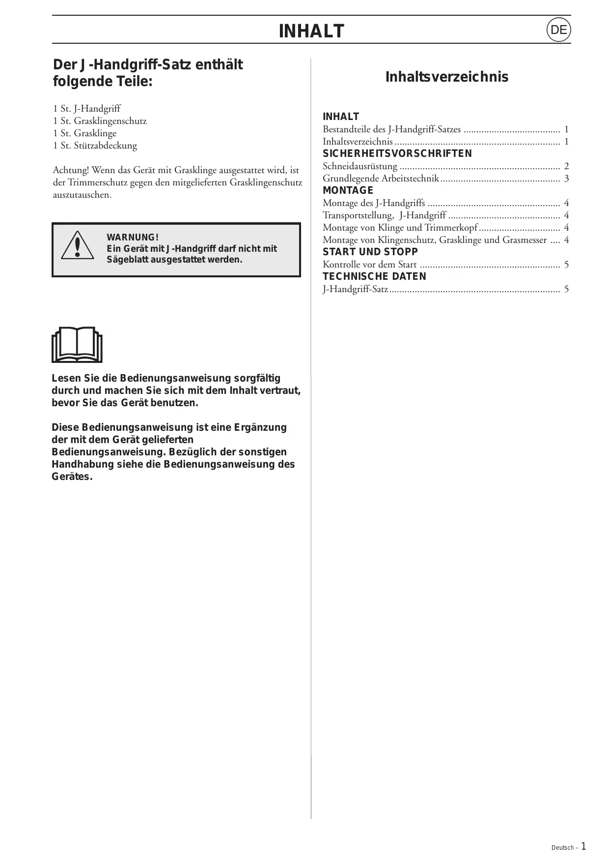 Inhaltsverzeichnis INHALT Bestandteile des J-Handgriff-Satzes Inhaltsverzeichnis SICHERHEITSVORSCHRIFTEN Schneidausrüstung Grundlegende Arbeitstechnik MONTAGE Montage des J-Handgriffs Transportstellung, J-Handgriff Montage von Klinge und Trimmerkopf Montage von Klingenschutz, Grasklinge und Grasmesser .... START UND STOPP Kontrolle vor dem Start TECHNISCHE DATEN J-Handgriff-Satz