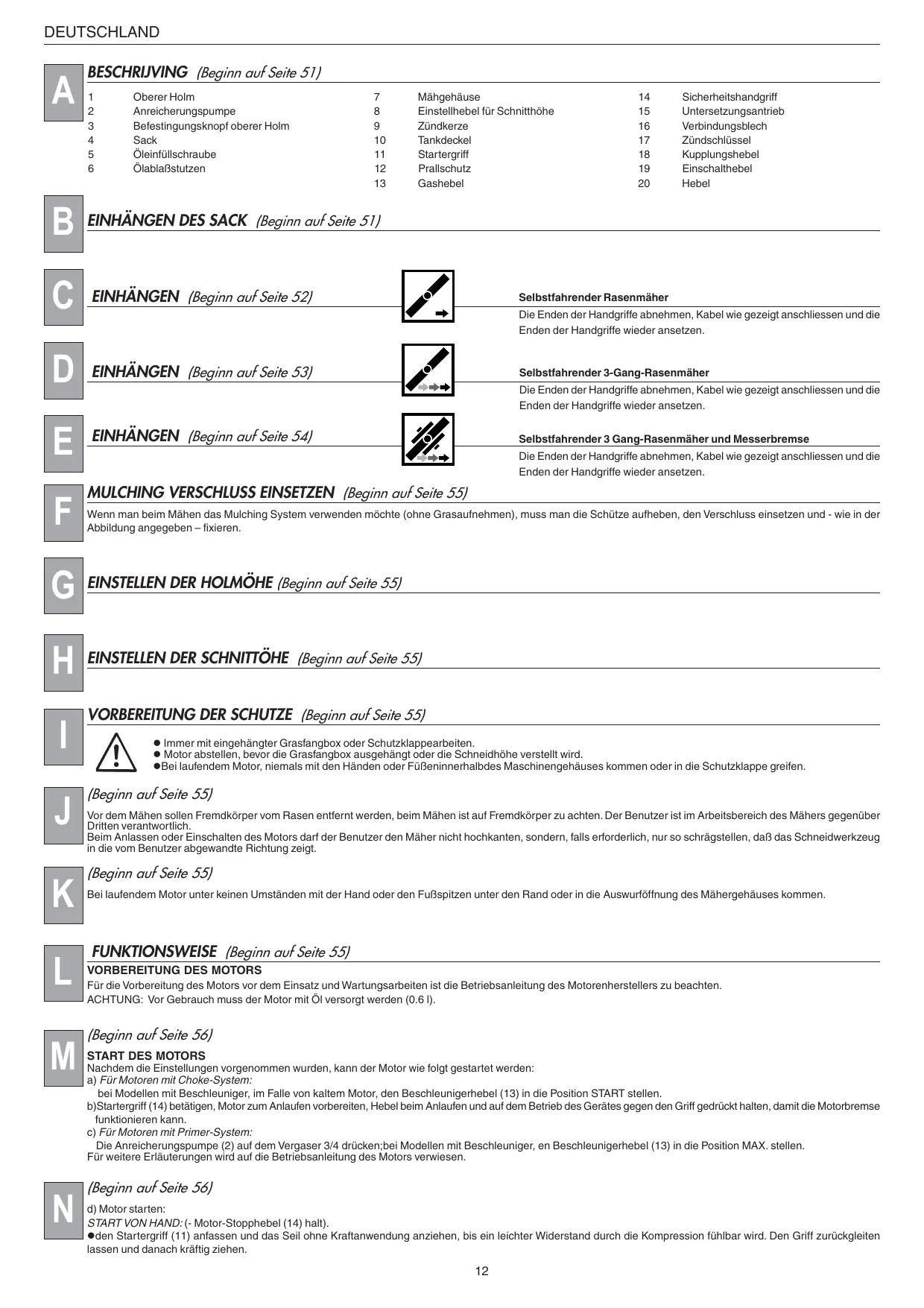 Lors de la mise en marche du moteur l'utilisateur ne doit pas soulever la tondeuse, toutfois si necessaire, il peut seulement l'incliner de sorte que la lame se trouve du coté opposé a l'utilisateur.