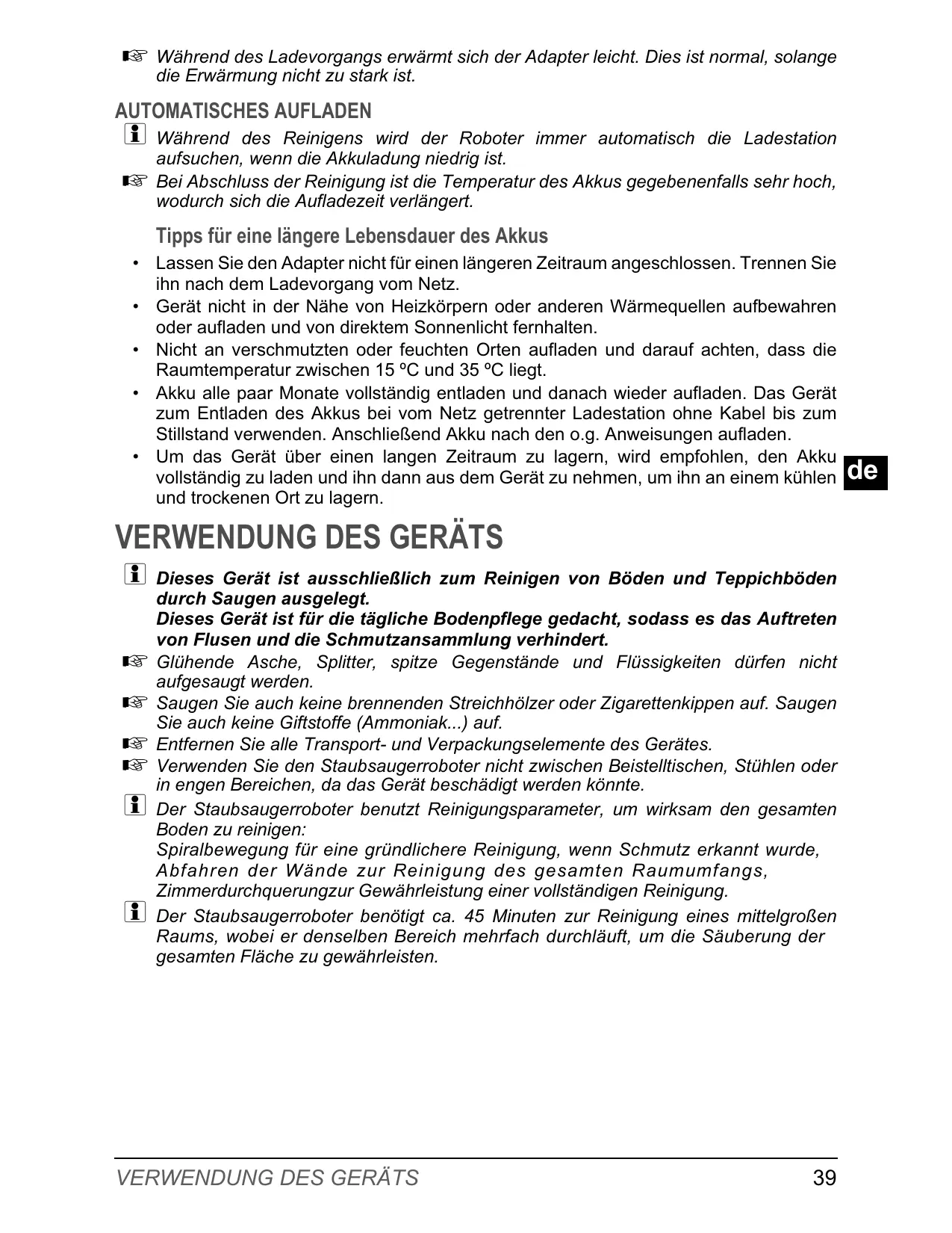 durch Saugen ausgelegt. Dieses Gerät ist für die tägliche Bodenpflege gedacht, sodass es das Auftreten von Flusen und die Schmutzansammlung verhindert. Glühende Asche, Splitter, spitze Gegenstände und Flüssigkeiten dürfen nicht aufgesaugt werden. Saugen Sie auch keine brennenden Streichhölzer oder Zigarettenkippen auf. Saugen Sie auch keine Giftstoffe (Ammoniak...) auf. Entfernen Sie alle Transport- und Verpackungselemente des Gerätes. Verwenden Sie den Staubsaugerroboter nicht zwischen Beistelltischen, Stühlen oder in engen Bereichen, da das Gerät beschädigt werden könnte. Der Staubsaugerroboter benutzt Reinigungsparameter, um wirksam den gesamten Boden zu reinigen: Spiralbewegung für eine gründlichere Reinigung, wenn Schmutz erkannt wurde, Abfahren der Wände zur Reinigung des gesamten Raumumfangs, Zimmerdurchquerungzur Gewährleistung einer vollständigen Reinigung. Der Staubsaugerroboter benötigt ca. 45 Minuten zur Reinigung eines mittelgroßen Raums, wobei er denselben Bereich mehrfach durchläuft, um die Säuberung der gesamten Fläche zu gewährleisten.