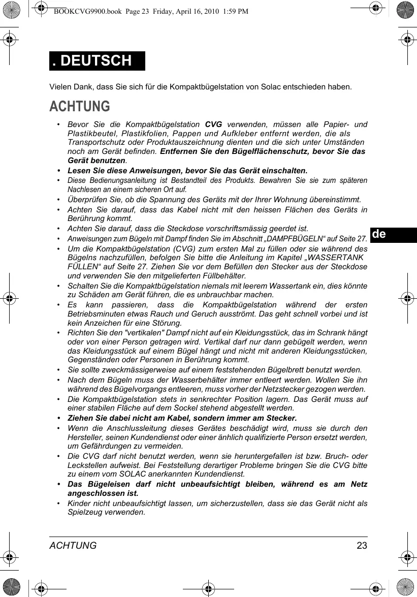 AUTRES FONCTIONS BOOKCVG9900.book Page 23 Friday, April 16, 2010 1:59 PM . DEUTSCH Vielen Dank, dass Sie sich für die Kompaktbügelstation von Solac entschieden haben. ACHTUNG