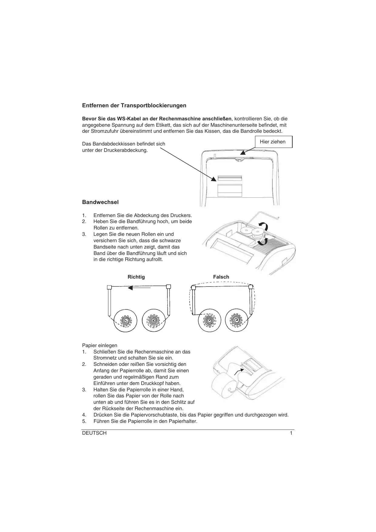 Entfernen der Transportblockierungen Bevor Sie das WS-Kabel an der Rechenmaschine anschließen, kontrollieren Sie, ob die angegebene Spannung auf dem Etikett, das sich auf der Maschinenunterseite befindet, mit der Stromzufuhr übereinstimmt und entfernen Sie das Kissen, das die Bandrolle bedeckt. Hier ziehen Das Bandabdeckkissen befindet sich unter der Druckerabdeckung. Bandwechsel