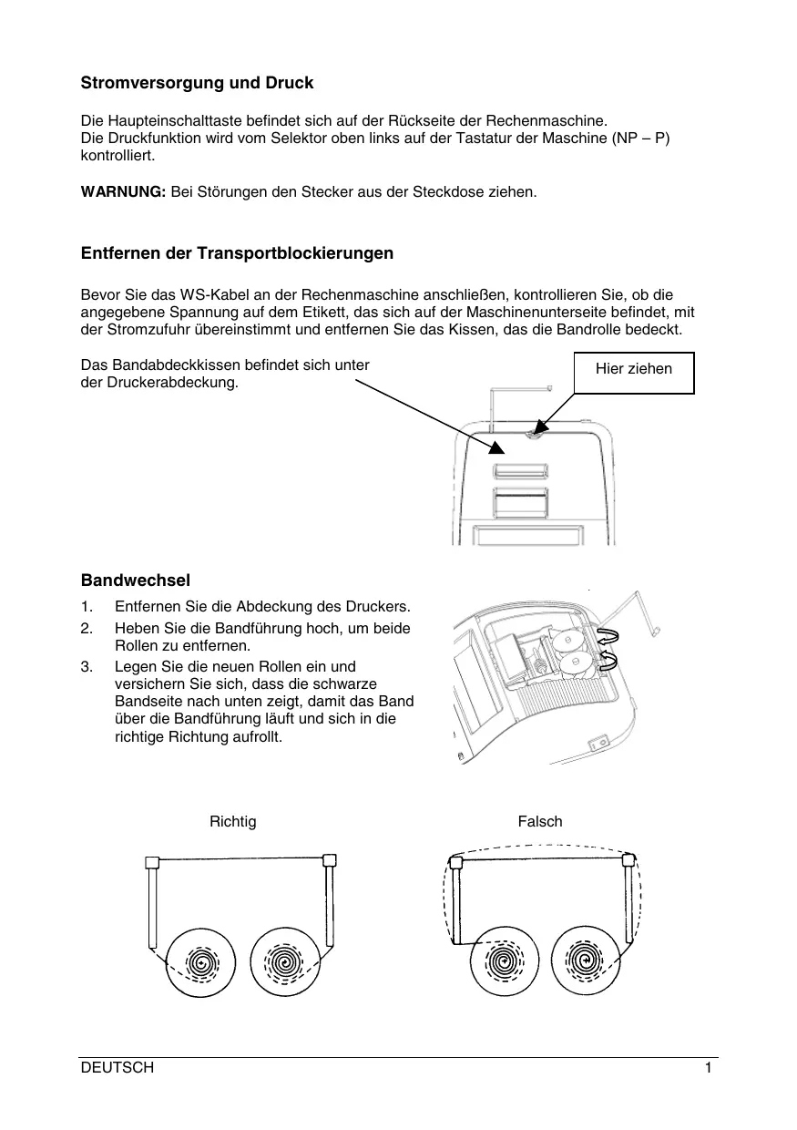 FRANÇAIS Stromversorgung und Druck Die Haupteinschalttaste befindet sich auf der Rückseite der Rechenmaschine. Die Druckfunktion wird vom Selektor oben links auf der Tastatur der Maschine (NP – P) kontrolliert. WARNUNG: Bei Störungen den Stecker aus der Steckdose ziehen. Entfernen der Transportblockierungen Bevor Sie das WS-Kabel an der Rechenmaschine anschließen, kontrollieren Sie, ob die angegebene Spannung auf dem Etikett, das sich auf der Maschinenunterseite befindet, mit der Stromzufuhr übereinstimmt und entfernen Sie das Kissen, das die Bandrolle bedeckt. Das Bandabdeckkissen befindet sich unter der Druckerabdeckung. Hier ziehen Bandwechsel