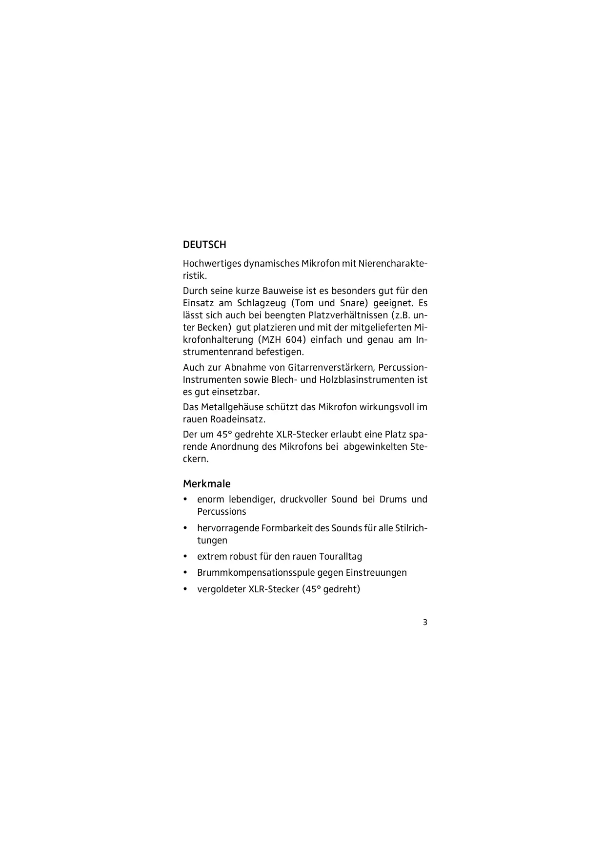 - Gebruiksaanwijzing DEUTSCH Hochwertiges dynamisches Mikrofon mit Nierencharakteristik. Durch seine kurze Bauweise ist es besonders gut für den Einsatz am Schlagzeug (Tom und Snare) geeignet. Es lässt sich auch bei beengten Platzverhältnissen (z.B. unter Becken) gut platzieren und mit der mitgelieferten Mikrofonhalterung (MZH 604) einfach und genau am Instrumentenrand befestigen. Auch zur Abnahme von Gitarrenverstärkern, PercussionInstrumenten sowie Blech- und Holzblasinstrumenten ist es gut einsetzbar. Das Metallgehäuse schützt das Mikrofon wirkungsvoll im rauen Roadeinsatz. Der um 45° gedrehte XLR-Stecker erlaubt eine Platz sparende Anordnung des Mikrofons bei abgewinkelten Steckern. Merkmale y enorm lebendiger, druckvoller Sound bei Drums und Percussions y hervorragende Formbarkeit des Sounds für alle Stilrichtungen y extrem robust für den rauen Touralltag y Brummkompensationsspule gegen Einstreuungen y vergoldeter XLR-Stecker (45° gedreht) p. 33