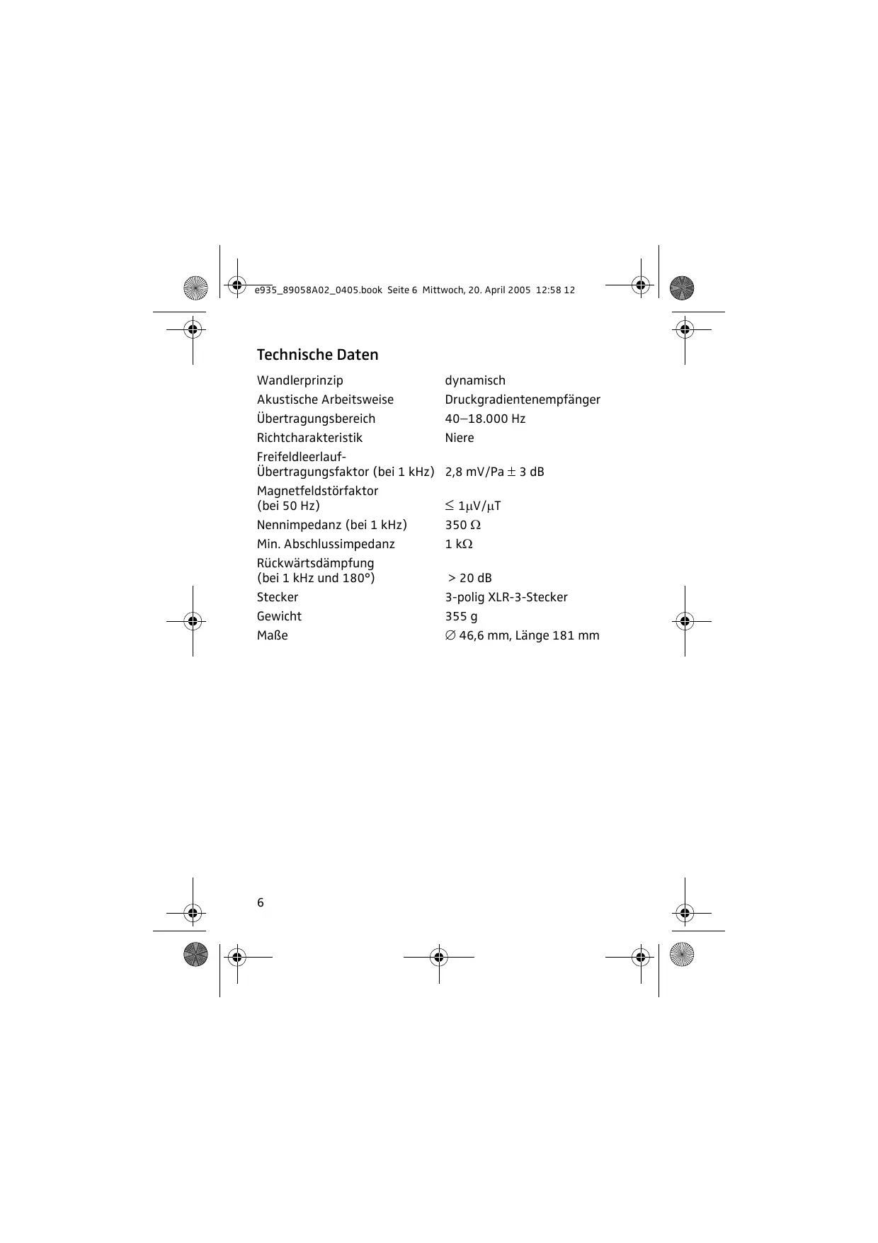 dynamisch Druckgradientenempfänger 40−18.000 Hz Niere 2,8 mV/Pa ± 3 dB ≤ 1µV/µT 350 Ω 1 kΩ > 20 dB 3-polig XLR-3-Stecker 355 g ∅ 46,6 mm, Länge 181 mm e935_89058A02_0405.book Seite 7 Mittwoch, 20. April 2005 12:58 12