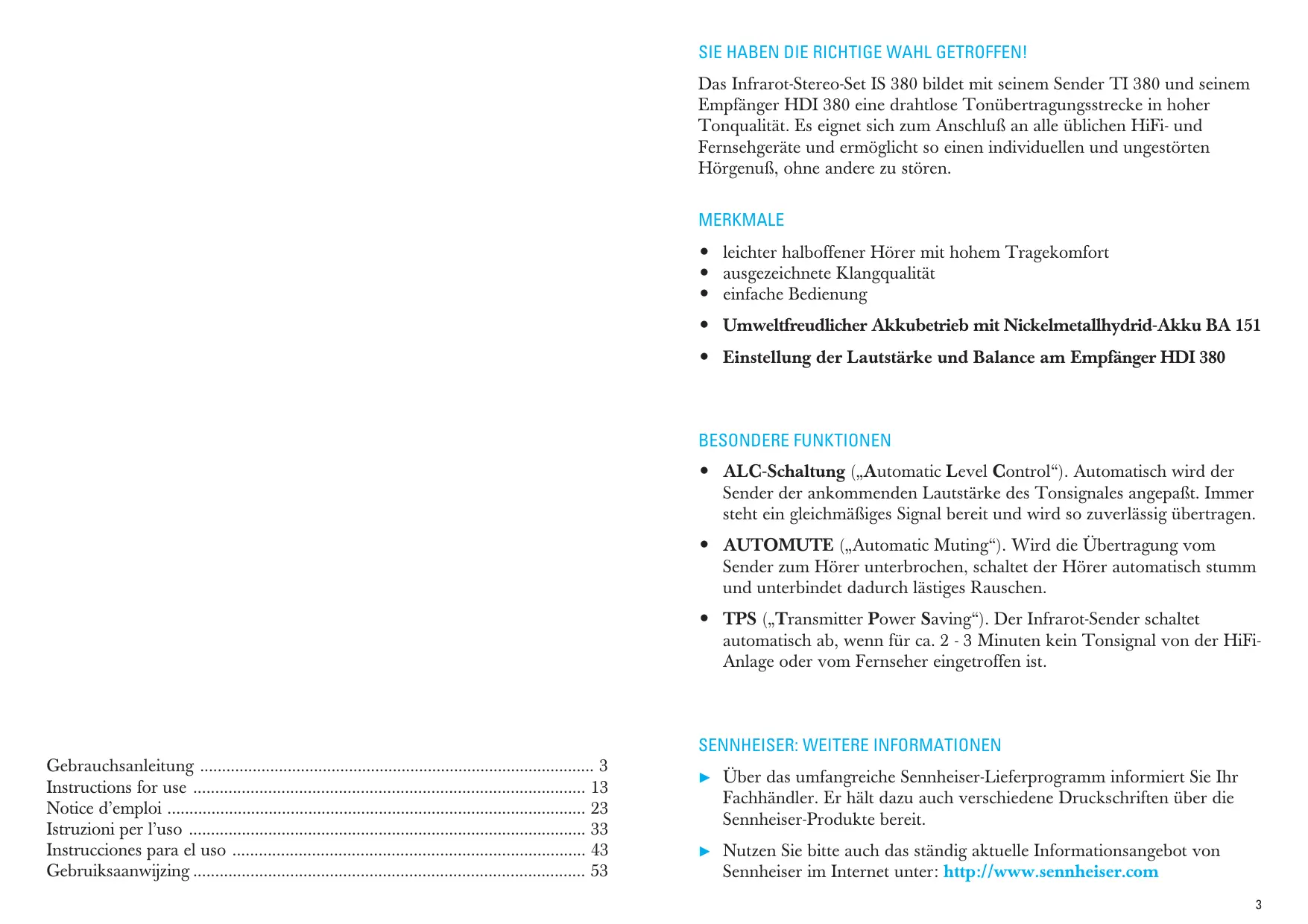 BEDIENUNGSANLEITUNG IS 380 SENNHEISER