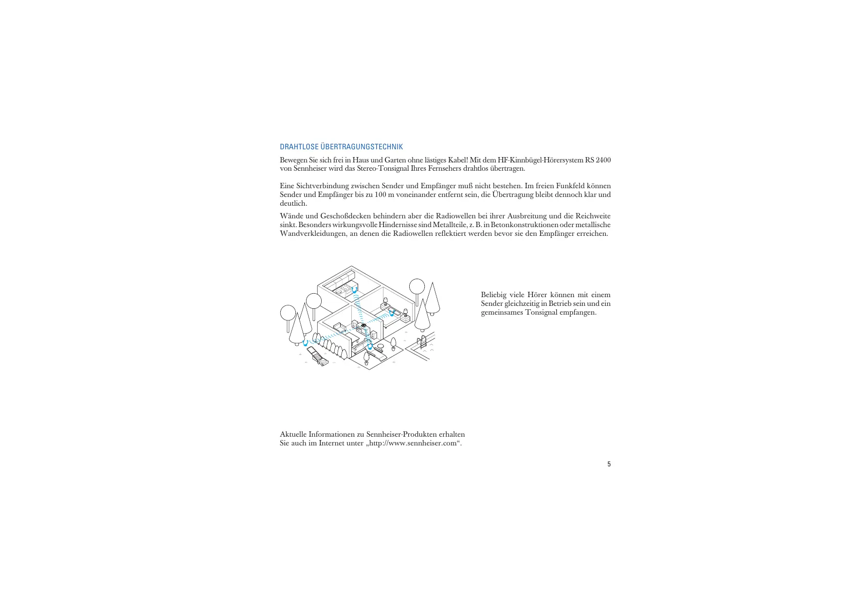 DRAHTLOSE ÜBERTRAGUNGSTECHNIK Bewegen Sie sich frei in Haus und Garten ohne lästiges Kabel! Mit dem HF-Kinnbügel-Hörersystem RS 2400 von Sennheiser wird das Stereo-Tonsignal Ihres Fernsehers drahtlos übertragen. Eine Sichtverbindung zwischen Sender und Empfänger muß nicht bestehen. Im freien Funkfeld können Sender und Empfänger bis zu 100 m voneinander entfernt sein, die Übertragung bleibt dennoch klar und deutlich. Wände und Geschoßdecken behindern aber die Radiowellen bei ihrer Ausbreitung und die Reichweite sinkt. Besonders wirkungsvolle Hindernisse sind Metallteile, z. B. in Betonkonstruktionen oder metallische Wandverkleidungen, an denen die Radiowellen reflektiert werden bevor sie den Empfänger erreichen. Beliebig viele Hörer können mit einem Sender gleichzeitig in Betrieb sein und ein gemeinsames Tonsignal empfangen. Aktuelle Informationen zu Sennheiser-Produkten erhalten Sie auch im Internet unter „http://www.sennheiser.com“.