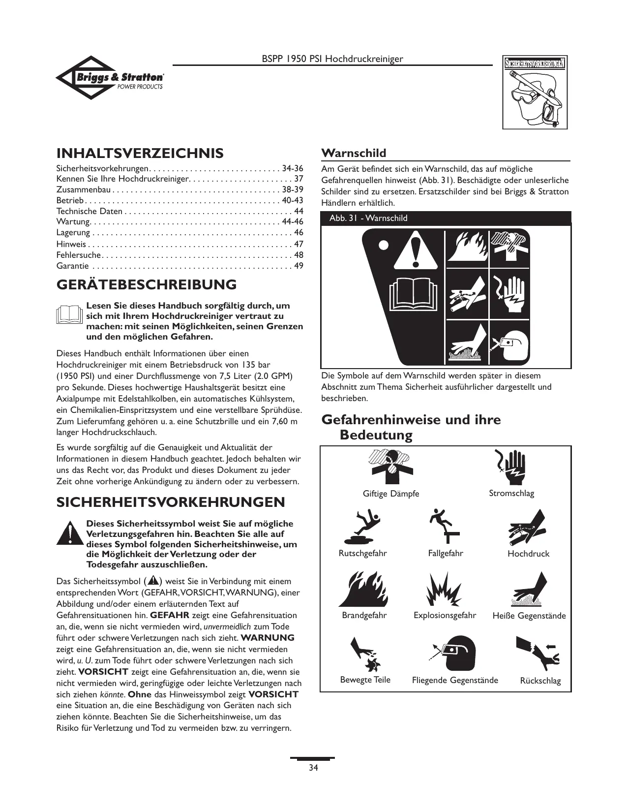- BSPP 1950 PSI Hochdruckreiniger INHALTSVERZEICHNIS Warnschild Sicherheitsvorkehrungen p. 34