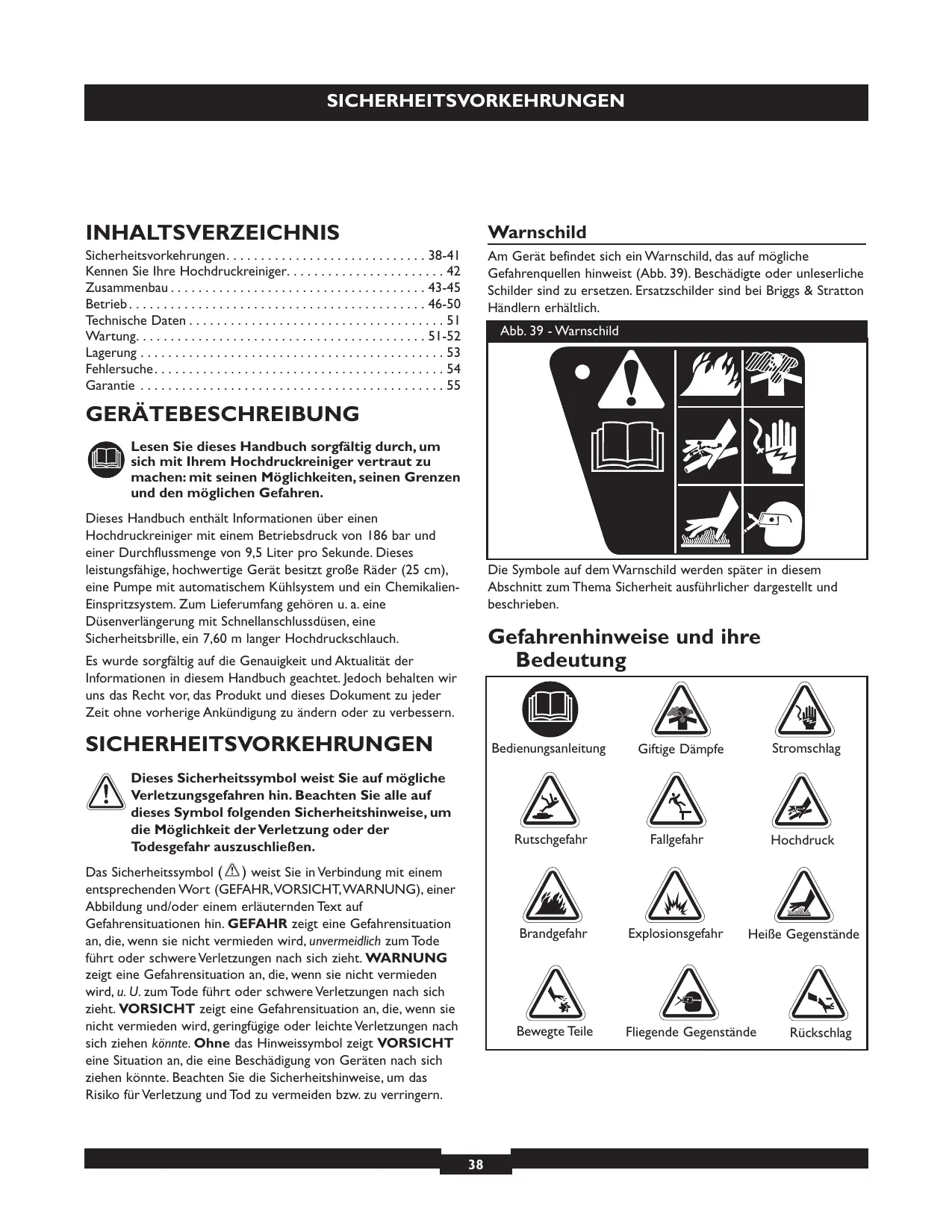 - Garantie Am Gerät befindet sich ein Warnschild, das auf mögliche Gefahrenquellen hinweist (Abb. 39). Beschädigte oder unleserliche Schilder sind zu ersetzen. Ersatzschilder sind bei Briggs & Stratton Händlern erhältlich. Abb. 39 - Warnschild GERÄTEBESCHREIBUNG Lesen Sie dieses Handbuch sorgfältig durch, um sich mit Ihrem Hochdruckreiniger vertraut zu machen: mit seinen Möglichkeiten, seinen Grenzen und den möglichen Gefahren. Dieses Handbuch enthält Informationen über einen Hochdruckreiniger mit einem Betriebsdruck von 186 bar und einer Durchflussmenge von 9,5 Liter pro Sekunde. Dieses leistungsfähige, hochwertige Gerät besitzt große Räder (25 cm), eine Pumpe mit automatischem Kühlsystem und ein ChemikalienEinspritzsystem. Zum Lieferumfang gehören u. a. eine Düsenverlängerung mit Schnellanschlussdüsen, eine Sicherheitsbrille, ein 7,60 m langer Hochdruckschlauch. Die Symbole auf dem Warnschild werden später in diesem Abschnitt zum Thema Sicherheit ausführlicher dargestellt und beschrieben. Gefahrenhinweise und ihre Bedeutung Es wurde sorgfältig auf die Genauigkeit und Aktualität der Informationen in diesem Handbuch geachtet. Jedoch behalten wir uns das Recht vor, das Produkt und dieses Dokument zu jeder Zeit ohne vorherige Ankündigung zu ändern oder zu verbessern. SICHERHEITSVORKEHRUNGEN Dieses Sicherheitssymbol weist Sie auf mögliche Verletzungsgefahren hin. Beachten Sie alle auf dieses Symbol folgenden Sicherheitshinweise, um die Möglichkeit der Verletzung oder der Todesgefahr auszuschließen. Das Sicherheitssymbol ( ) weist Sie in Verbindung mit einem entsprechenden Wort (GEFAHR,VORSICHT,WARNUNG), einer Abbildung und/oder einem erläuternden Text auf Gefahrensituationen hin. GEFAHR zeigt eine Gefahrensituation an, die, wenn sie nicht vermieden wird, unvermeidlich zum Tode führt oder schwere Verletzungen nach sich zieht. WARNUNG zeigt eine Gefahrensituation an, die, wenn sie nicht vermieden wird, u. U. zum Tode führt oder schwere Verletzungen nach sich zieht. VORSICHT zeigt eine Gefahrensituation an, die, wenn sie nicht vermieden wird, geringfügige oder leichte Verletzungen nach sich ziehen könnte. Ohne das Hinweissymbol zeigt VORSICHT eine Situation an, die eine Beschädigung von Geräten nach sich ziehen könnte. Beachten Sie die Sicherheitshinweise, um das Risiko für Verletzung und Tod zu vermeiden bzw. zu verringern. p. 55