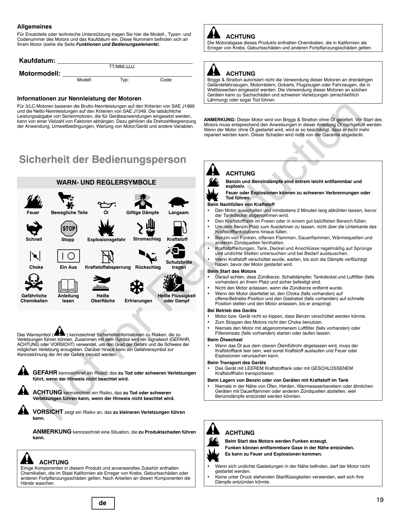 - Niemals den Motor mit abgenommenem Luftfilter (falls vorhanden) oder Filtereinsatz (falls vorhanden) starten oder laufen lassen. VORSICHT zeigt ein Risiko an, das zu kleineren Verletzungen führen kann. ANMERKUNG kennzeichnet eine Situation, die zu Produktschaden führen ACHTUNG kann. Beim Start des Motors werden Funken erzeugt. Funken können entflammbare Gase in der Nähe entzünden. Es kann zu Feuer und Explosionen kommen. ACHTUNG Einige Komponenten in diesem Produkt und anverwandtes Zubehör enthalten Chemikalien, die im Staat Kalifornien als Erreger von Krebs, Geburtsschäden oder anderen Fortpflanzungsschäden gelten. Nach Arbeiten an diesen Komponenten die Hände waschen.