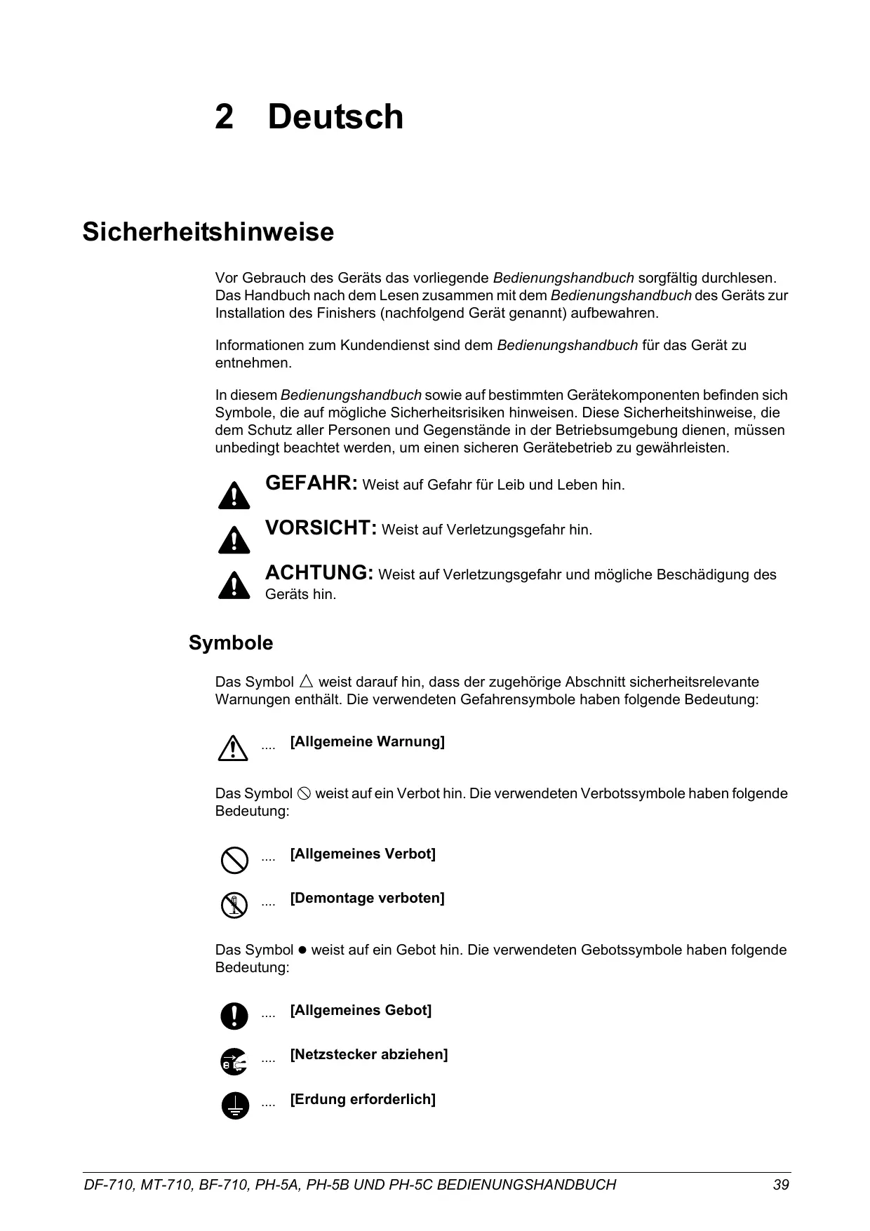 DF-710, MT-710, BF-710, PH-5A, PH-5B AND PH-5C OPERATION GUIDE 2 Deutsch Sicherheitshinweise Vor Gebrauch des Geräts das vorliegende Bedienungshandbuch sorgfältig durchlesen. Das Handbuch nach dem Lesen zusammen mit dem Bedienungshandbuch des Geräts zur Installation des Finishers (nachfolgend Gerät genannt) aufbewahren. Informationen zum Kundendienst sind dem Bedienungshandbuch für das Gerät zu entnehmen. In diesem Bedienungshandbuch sowie auf bestimmten Gerätekomponenten befinden sich Symbole, die auf mögliche Sicherheitsrisiken hinweisen. Diese Sicherheitshinweise, die dem Schutz aller Personen und Gegenstände in der Betriebsumgebung dienen, müssen unbedingt beachtet werden, um einen sicheren Gerätebetrieb zu gewährleisten. GEFAHR: Weist auf Gefahr für Leib und Leben hin. VORSICHT: Weist auf Verletzungsgefahr hin. ACHTUNG: Weist auf Verletzungsgefahr und mögliche Beschädigung des Geräts hin. Symbole Das Symbol weist darauf hin, dass der zugehörige Abschnitt sicherheitsrelevante Warnungen enthält. Die verwendeten Gefahrensymbole haben folgende Bedeutung: