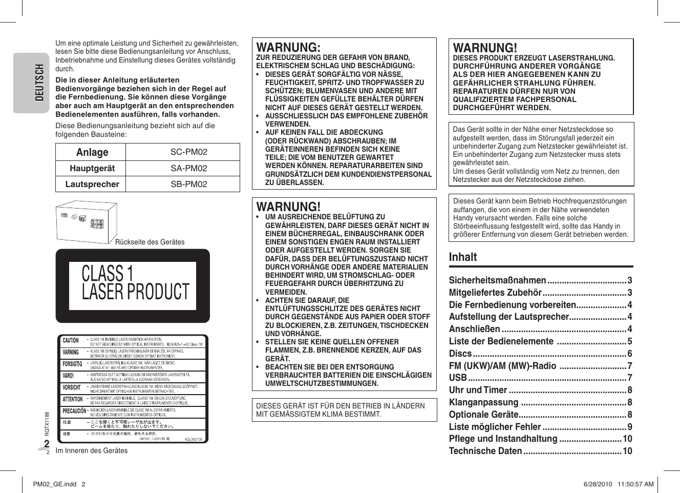 UMWELTSCHUTZBESTIMMUNGEN. Im Inneren des Gerätes PM02_GE.indd 2 WARNUNG! DIESES PRODUKT ERZEUGT LASERSTRAHLUNG.