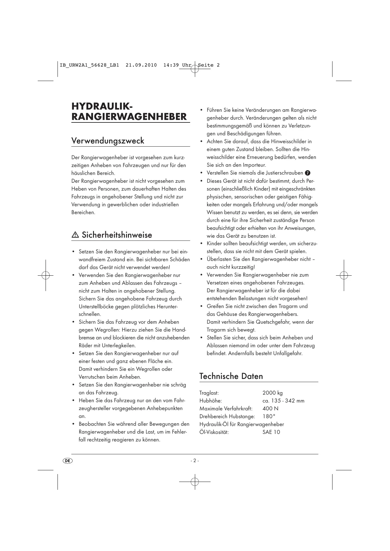 Verwendungszweck Der Rangierwagenheber ist vorgesehen zum kurzzeitigen Anheben von Fahrzeugen und nur für den häuslichen Bereich. Der Rangierwagenheber ist nicht vorgesehen zum Heben von Personen, zum dauerhaften Halten des Fahrzeugs in angehobener Stellung und nicht zur Verwendung in gewerblichen oder industriellen Bereichen.