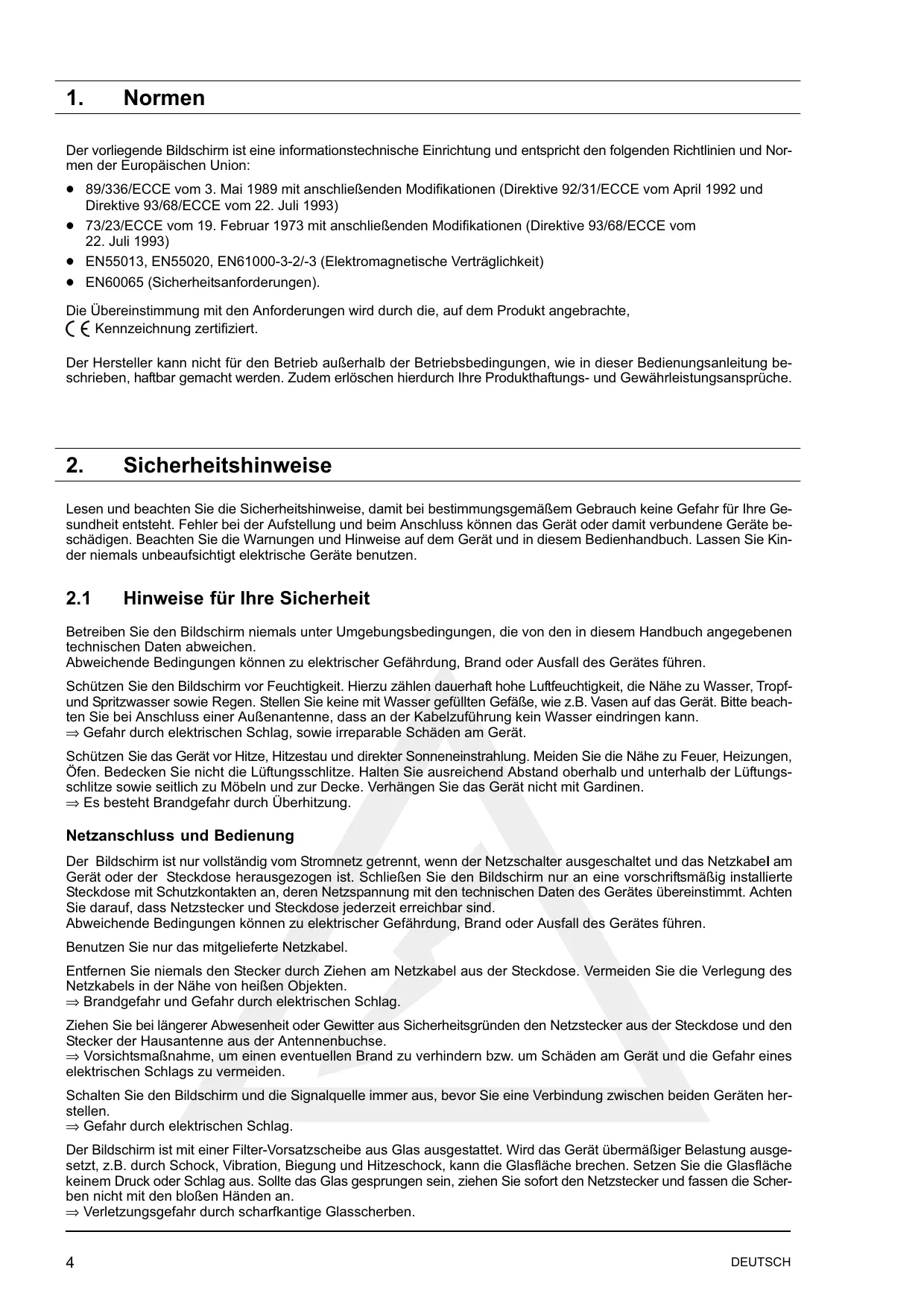 Normen Der vorliegende Bildschirm ist eine informationstechnische Einrichtung und entspricht den folgenden Richtlinien und NorĆ men der Europäischen Union: 89/336/ECCE vom 3. Mai 1989 mit anschließenden Modifikationen (Direktive 92/31/ECCE vom April 1992 und Direktive 93/68/ECCE vom 22. Juli 1993) 73/23/ECCE vom 19. Februar 1973 mit anschließenden Modifikationen (Direktive 93/68/ECCE vom