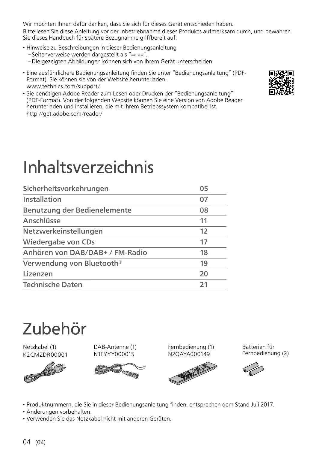 Wir möchten Ihnen dafür danken, dass Sie sich für dieses Gerät entschieden haben. Bitte lesen Sie diese Anleitung vor der Inbetriebnahme dieses Produkts aufmerksam durch, und bewahren Sie dieses Handbuch für spätere Bezugnahme griffbereit auf. • Hinweise zu Beschreibungen in dieser Bedienungsanleitung - Seitenverweise werden dargestellt als “ ○○”. - Die gezeigten Abbildungen können sich von Ihrem Gerät unterscheiden. • Eine ausführlichere Bedienungsanleitung finden Sie unter “Bedienungsanleitung” (PDFFormat). Sie können sie von der Website herunterladen. www.technics.com/support/ • Sie benötigen Adobe Reader zum Lesen oder Drucken der “Bedienungsanleitung” (PDF-Format). Von der folgenden Website können Sie eine Version von Adobe Reader herunterladen und installieren, die mit Ihrem Betriebssystem kompatibel ist. http://get.adobe.com/reader/
