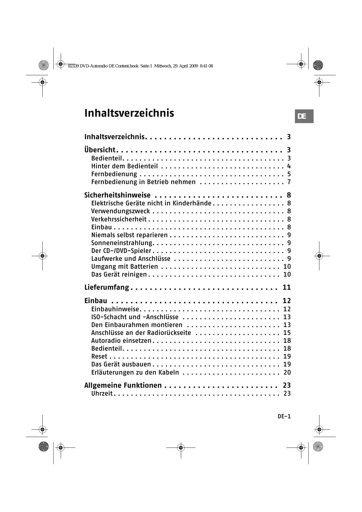 Allgemeine Funktionen . . . . . . . . . . . . . . . . . . . . . . . . 23 Uhrzeit . . . . . . . . . . . . . . . . . . . . . . . . . . . . . . . . . . . . . . . 23 DE-1 82339 DVD-Autoradio DE Content.book Seite 2 Mittwoch, 29. April 2009 8:41 08 Ein-/ausschalten . . . . . . . . . . . . . . . . . . . . . . . . . . . . . . . . Lautstärke. . . . . . . . . . . . . . . . . . . . . . . . . . . . . . . . . . . . . Betriebsart („Mode“) . . . . . . . . . . . . . . . . . . . . . . . . . . . . . Reset . . . . . . . . . . . . . . . . . . . . . . . . . . . . . . . . . . . . . . . . Grundeinstellungen für das Autoradio (MENU) . . . . . . . . . . . .