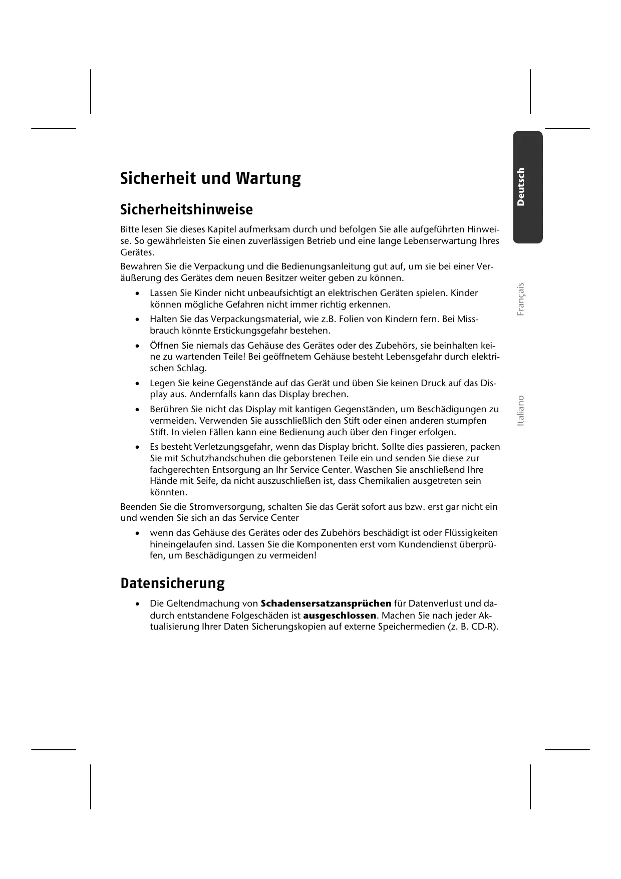 Die Geltendmachung von Schadensersatzansprüchen für Datenverlust und dadurch entstandene Folgeschäden ist ausgeschlossen. Machen Sie nach jeder Aktualisierung Ihrer Daten Sicherungskopien auf externe Speichermedien (z. B. CD-R). Italiano Bewahren Sie die Verpackung und die Bedienungsanleitung gut auf, um sie bei einer Veräußerung des Gerätes dem neuen Besitzer weiter geben zu können. Français Bitte lesen Sie dieses Kapitel aufmerksam durch und befolgen Sie alle aufgeführten Hinweise. So gewährleisten Sie einen zuverlässigen Betrieb und eine lange Lebenserwartung Ihres Gerätes. Bedingungen der Betriebsumgebung Das Nichtbeachten dieser Hinweise kann zu Störungen oder zur Beschädigung des Gerätes führen. Die Gewährleistung in diesen Fällen ist ausgeschlossen.