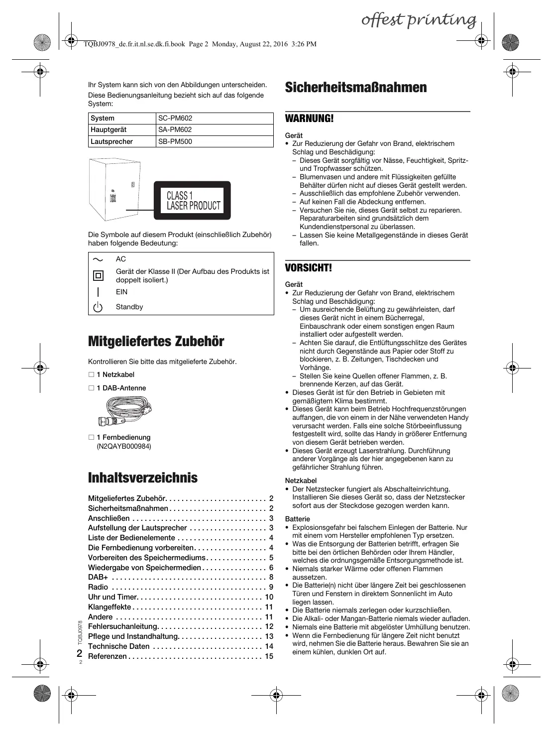 Gerät der Klasse II (Der Aufbau des Produkts ist doppelt isoliert.) EIN Standby Mitgeliefertes Zubehör Kontrollieren Sie bitte das mitgelieferte Zubehör. 1 Netzkabel 1 DAB-Antenne 1 Fernbedienung (N2QAYB000984) TQBJ0978 Inhaltsverzeichnis