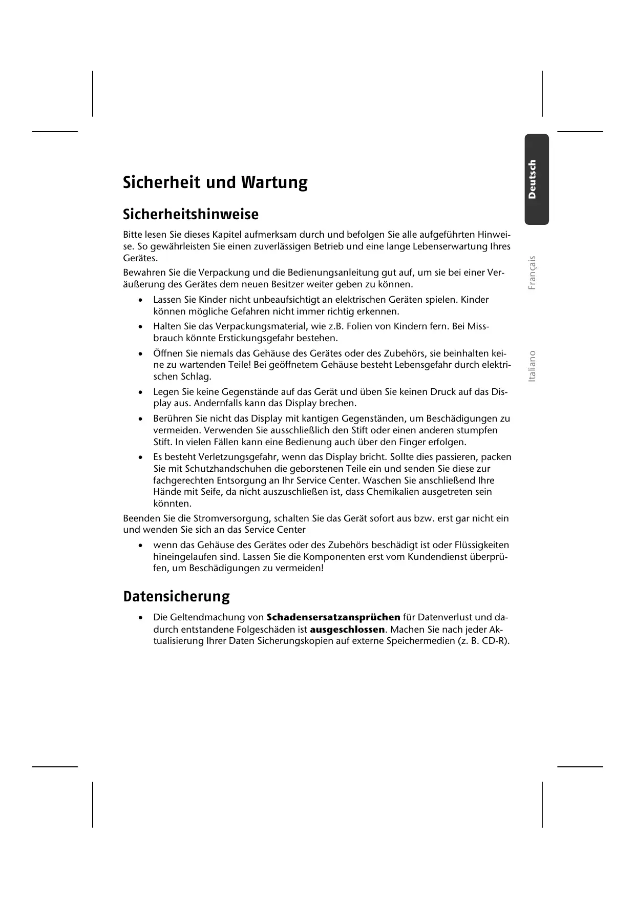 S SD/MMC-Steckplatz 12 Securityi, 23, 24, 28, 29 Fingerabdruck hinterlegen 26 Seriennummer i Service ii Hotline 75 Sicherheit Batterien 85 Sicherheitshinweise 1 Akkubetrieb 5 Anschließen 4 Betriebsumgebung 2 Datensicherung 1 Entsorgung 6 Navigation 32 Pflege des Displays 6 Reparatur 2 Stromversorgung 4 Transport 7 Umgebungstemperatur 2 Verkabelung 4 Wartung 5 Soft Reset 30 Sonderfunktion CleanUp 22, 76 Speicherkarten 89 Sprachkommandos 42 Stromversorgung 4, 17 Stromversorgung über Autoadapter .... 4 Sudoku Hauptbildschirm 72