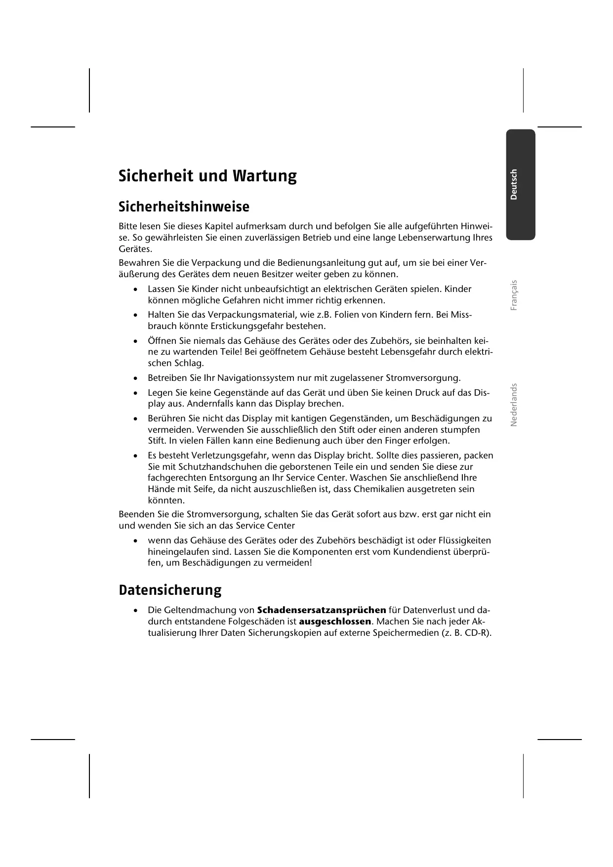 Die Geltendmachung von Schadensersatzansprüchen für Datenverlust und dadurch entstandene Folgeschäden ist ausgeschlossen. Machen Sie nach jeder Aktualisierung Ihrer Daten Sicherungskopien auf externe Speichermedien (z. B. CD-R).