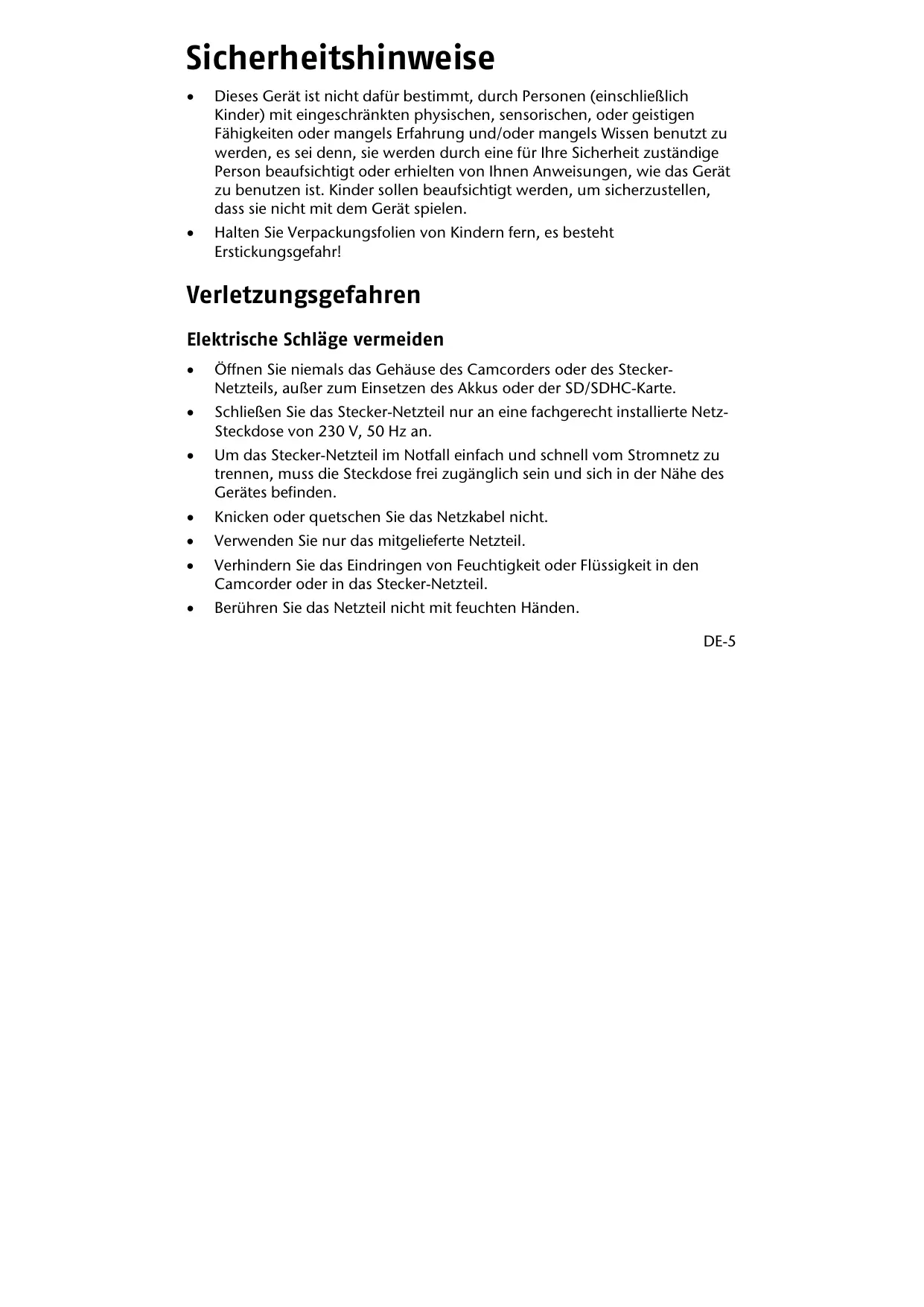 Warten Sie mit dem Anschluss des Netzteils, wenn das Gerät von einer kalten Umgebung in einen warmen Raum gebracht wird. Wenn das Ladegerät Zimmertemperatur erreicht hat, kann das Ladegerät gefahrlos zum Laden angeschlossen werden. Benutzen bzw. lagern Sie den Camcorder nicht im direkten Sonnenlicht oder bei hohen Temperaturen. DE-9 Bei niedrigen Temperaturen kann die Kapazität des Akkus durch die Verlangsamung der chemischen Reaktion deutlich abnehmen. Halten Sie für Aufnahmen bei kaltem Wetter einen zweiten Akku an einem warmen Ort (z.B. Hosentasche) bereit. Dieses Zeichen auf Ihrem Camcorder bescheinigt, dass der Camcorder die EU-Richtlinien (Europäische Union) zu Störstrahlung erfüllt. CE steht für Conformité Européenne (europäische Konformität) Das Gerät ist nur für den privaten Gebrauch und nicht für den Betrieb in einem Unternehmen der Schwerindustrie konzipiert.