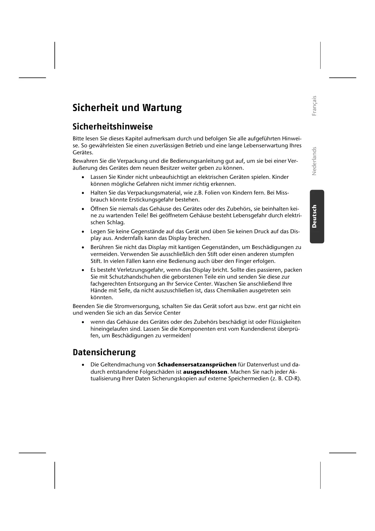 Die Geltendmachung von Schadensersatzansprüchen für Datenverlust und dadurch entstandene Folgeschäden ist ausgeschlossen. Machen Sie nach jeder Aktualisierung Ihrer Daten Sicherungskopien auf externe Speichermedien (z. B. CD-R).