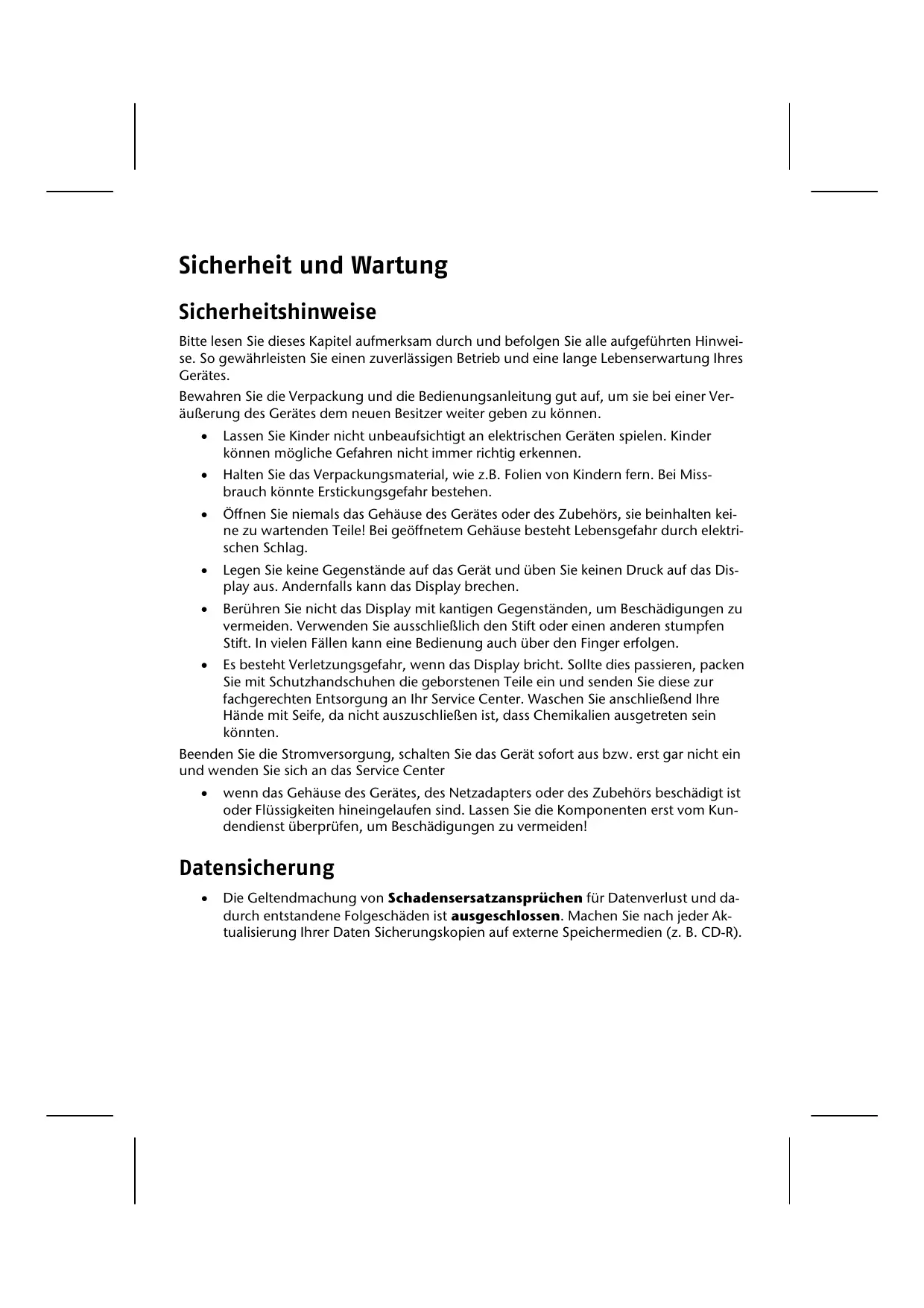 Die Geltendmachung von Schadensersatzansprüchen für Datenverlust und dadurch entstandene Folgeschäden ist ausgeschlossen. Machen Sie nach jeder Aktualisierung Ihrer Daten Sicherungskopien auf externe Speichermedien (z. B. CD-R).