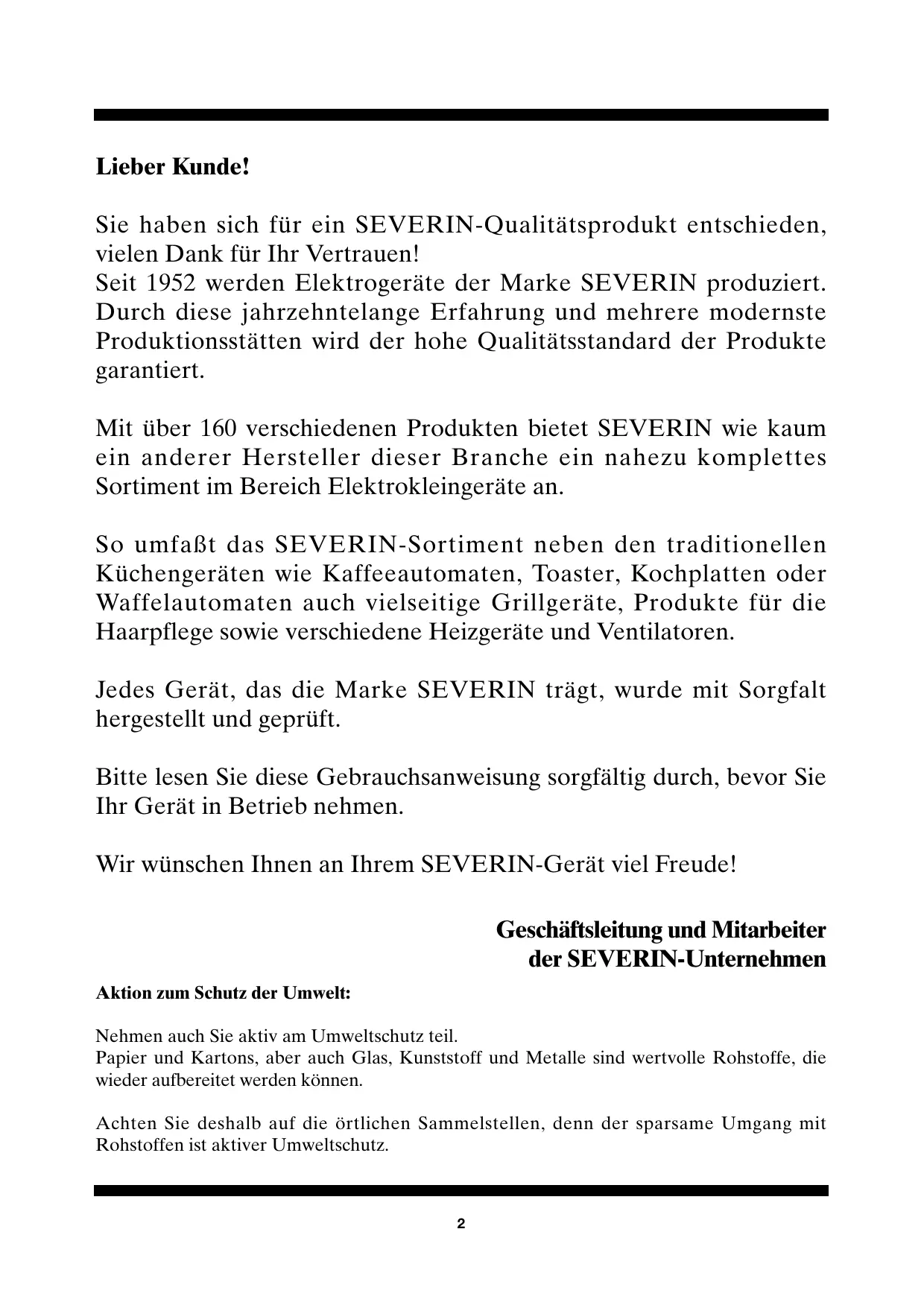 FIN RUS Lieber Kunde! Sie haben sich für ein SEVERIN-Qualitätsprodukt entschieden, vielen Dank für Ihr Vertrauen! Seit 1952 werden Elektrogeräte der Marke SEVERIN produziert. Durch diese jahrzehntelange Erfahrung und mehrere modernste Produktionsstätten wird der hohe Qualitätsstandard der Produkte garantiert. Mit über 160 verschiedenen Produkten bietet SEVERIN wie kaum ein anderer Hersteller dieser Branche ein nahezu komplettes Sortiment im Bereich Elektrokleingeräte an. So umfaßt das SEVERIN-Sortiment neben den traditionellen Küchengeräten wie Kaffeeautomaten, Toaster, Kochplatten oder Waffelautomaten auch vielseitige Grillgeräte, Produkte für die Haarpflege sowie verschiedene Heizgeräte und Ventilatoren. Jedes Gerät, das die Marke SEVERIN trägt, wurde mit Sorgfalt hergestellt und geprüft. Bitte lesen Sie diese Gebrauchsanweisung sorgfältig durch, bevor Sie Ihr Gerät in Betrieb nehmen. Wir wünschen Ihnen an Ihrem SEVERIN-Gerät viel Freude! Geschäftsleitung und Mitarbeiter der SEVERIN-Unternehmen Aktion zum Schutz der Umwelt: Nehmen auch Sie aktiv am Umweltschutz teil. Papier und Kartons, aber auch Glas, Kunststoff und Metalle sind wertvolle Rohstoffe, die wieder aufbereitet werden können. Achten Sie deshalb auf die örtlichen Sammelstellen, denn der sparsame Umgang mit Rohstoffen ist aktiver Umweltschutz.