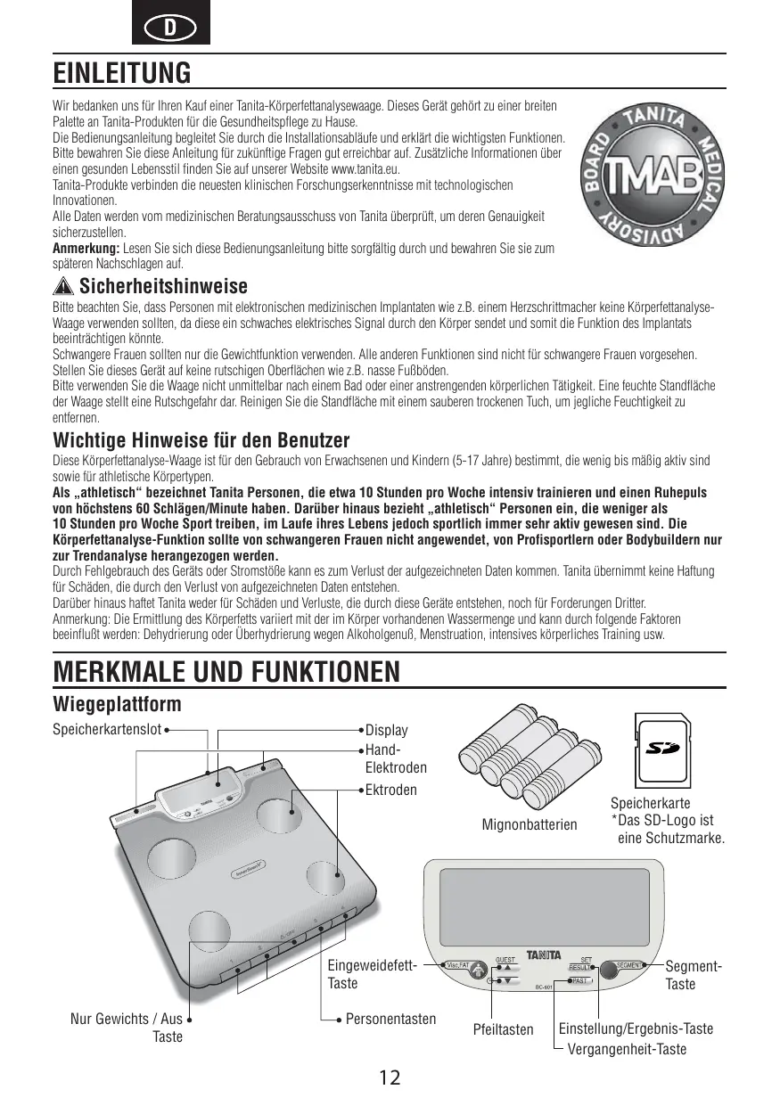 EINLEITUNG Wir bedanken uns für Ihren Kauf einer Tanita-Körperfettanalysewaage. Dieses Gerät gehört zu einer breiten Palette an Tanita-Produkten für die Gesundheitspflege zu Hause. Die Bedienungsanleitung begleitet Sie durch die Installationsabläufe und erklärt die wichtigsten Funktionen. Bitte bewahren Sie diese Anleitung für zukünftige Fragen gut erreichbar auf. Zusätzliche Informationen über einen gesunden Lebensstil finden Sie auf unserer Website www.tanita.eu. Tanita-Produkte verbinden die neuesten klinischen Forschungserkenntnisse mit technologischen Innovationen. Alle Daten werden vom medizinischen Beratungsausschuss von Tanita überprüft, um deren Genauigkeit sicherzustellen. Anmerkung: Lesen Sie sich diese Bedienungsanleitung bitte sorgfältig durch und bewahren Sie sie zum späteren Nachschlagen auf. Sicherheitshinweise Bitte beachten Sie, dass Personen mit elektronischen medizinischen Implantaten wie z.B. einem Herzschrittmacher keine KörperfettanalyseWaage verwenden sollten, da diese ein schwaches elektrisches Signal durch den Körper sendet und somit die Funktion des Implantats beeinträchtigen könnte. Schwangere Frauen sollten nur die Gewichtfunktion verwenden. Alle anderen Funktionen sind nicht für schwangere Frauen vorgesehen. Stellen Sie dieses Gerät auf keine rutschigen Oberflächen wie z.B. nasse Fußböden. Bitte verwenden Sie die Waage nicht unmittelbar nach einem Bad oder einer anstrengenden körperlichen Tätigkeit. Eine feuchte Standfläche der Waage stellt eine Rutschgefahr dar. Reinigen Sie die Standfläche mit einem sauberen trockenen Tuch, um jegliche Feuchtigkeit zu entfernen. Wichtige Hinweise für den Benutzer Diese Körperfettanalyse-Waage ist für den Gebrauch von Erwachsenen und Kindern (5-17 Jahre) bestimmt, die wenig bis mäßig aktiv sind sowie für athletische Körpertypen. Als „athletisch“ bezeichnet Tanita Personen, die etwa 10 Stunden pro Woche intensiv trainieren und einen Ruhepuls von höchstens 60 Schlägen/Minute haben. Darüber hinaus bezieht „athletisch“ Personen ein, die weniger als 10 Stunden pro Woche Sport treiben, im Laufe ihres Lebens jedoch sportlich immer sehr aktiv gewesen sind. Die Körperfettanalyse-Funktion sollte von schwangeren Frauen nicht angewendet, von Profisportlern oder Bodybuildern nur zur Trendanalyse herangezogen werden. Durch Fehlgebrauch des Geräts oder Stromstöße kann es zum Verlust der aufgezeichneten Daten kommen. Tanita übernimmt keine Haftung für Schäden, die durch den Verlust von aufgezeichneten Daten entstehen. Darüber hinaus haftet Tanita weder für Schäden und Verluste, die durch diese Geräte entstehen, noch für Forderungen Dritter. Anmerkung: Die Ermittlung des Körperfetts variiert mit der im Körper vorhandenen Wassermenge und kann durch folgende Faktoren beeinflußt werden: Dehydrierung oder Überhydrierung wegen Alkoholgenuß, Menstruation, intensives körperliches Training usw.