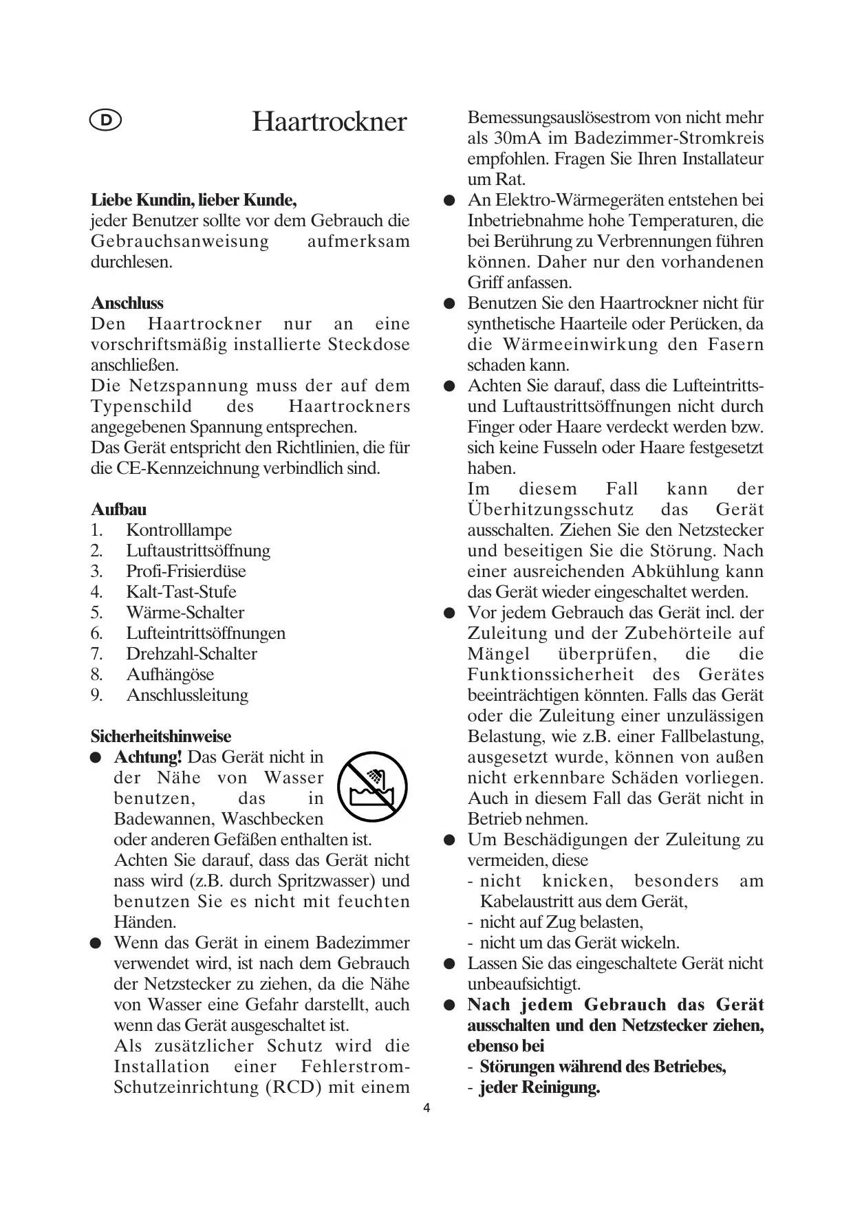 Anschluss Den Haartrockner nur an eine vorschriftsmäßig installierte Steckdose anschließen. Die Netzspannung muss der auf dem Typenschild des Haartrockners angegebenen Spannung entsprechen. Das Gerät entspricht den Richtlinien, die für die CE-Kennzeichnung verbindlich sind.