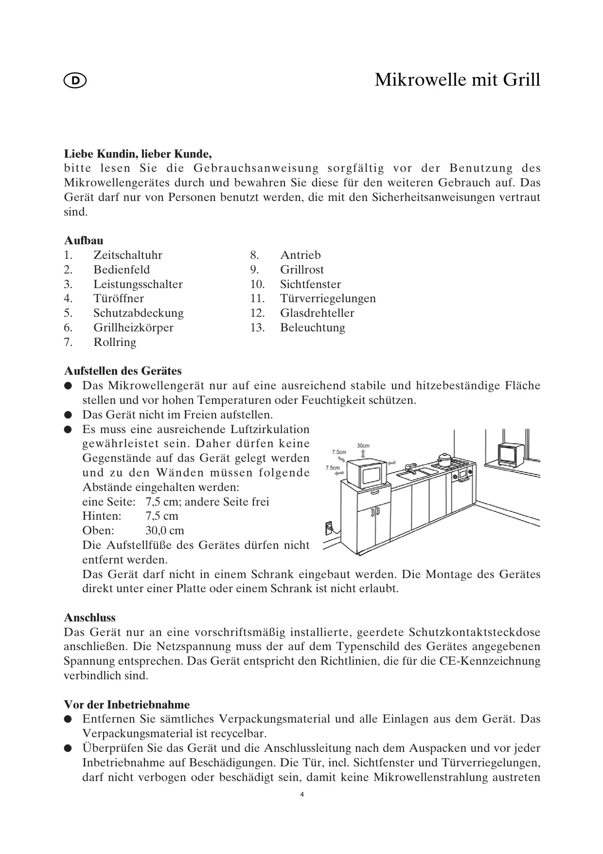 Mise en place de l’appareil ● Installez toujours le four à micro-ondes sur une surface stable et plane, résistante à la chaleur et à l’abri de toute source de chaleur ou d’humidité excessive. ● Abstenez-vous d’utiliser l’appareil en plein air. ● Une aération suffisante doit être constamment assurée. Ne placez aucun objet sur l’appareil et veillez à ce que les distances minimales suivantes soient respectées entre l’appareil et le mur ou tout autre objet: Un côté : 7.5 cm; sans obstruction de l'autre côté Arrière: 7.5 cm Hauteur: 30.0 cm Les pieds sous l’appareil ne doivent pas être enlevés. L’appareil ne doit pas être installé dans une armoire. Evitez aussi, au moment de mettre l’appareil en place, de l’installer immédiatement sous une armoire ou tout autre objet analogue. Connexion au secteur L’appareil doit être branché exclusivement sur une prise de courant avec terre, installée selon les normes. Assurez-vous que la tension d’alimentation correspond à la tension indiquée sur la plaque signalétique. Ce produit est conforme aux directives obligatoires inhérentes au marquage CE. Avant d’utiliser l’appareil ● Otez tout emballage externe et interne. Les matériaux d’emballage utilisés se prêtent au