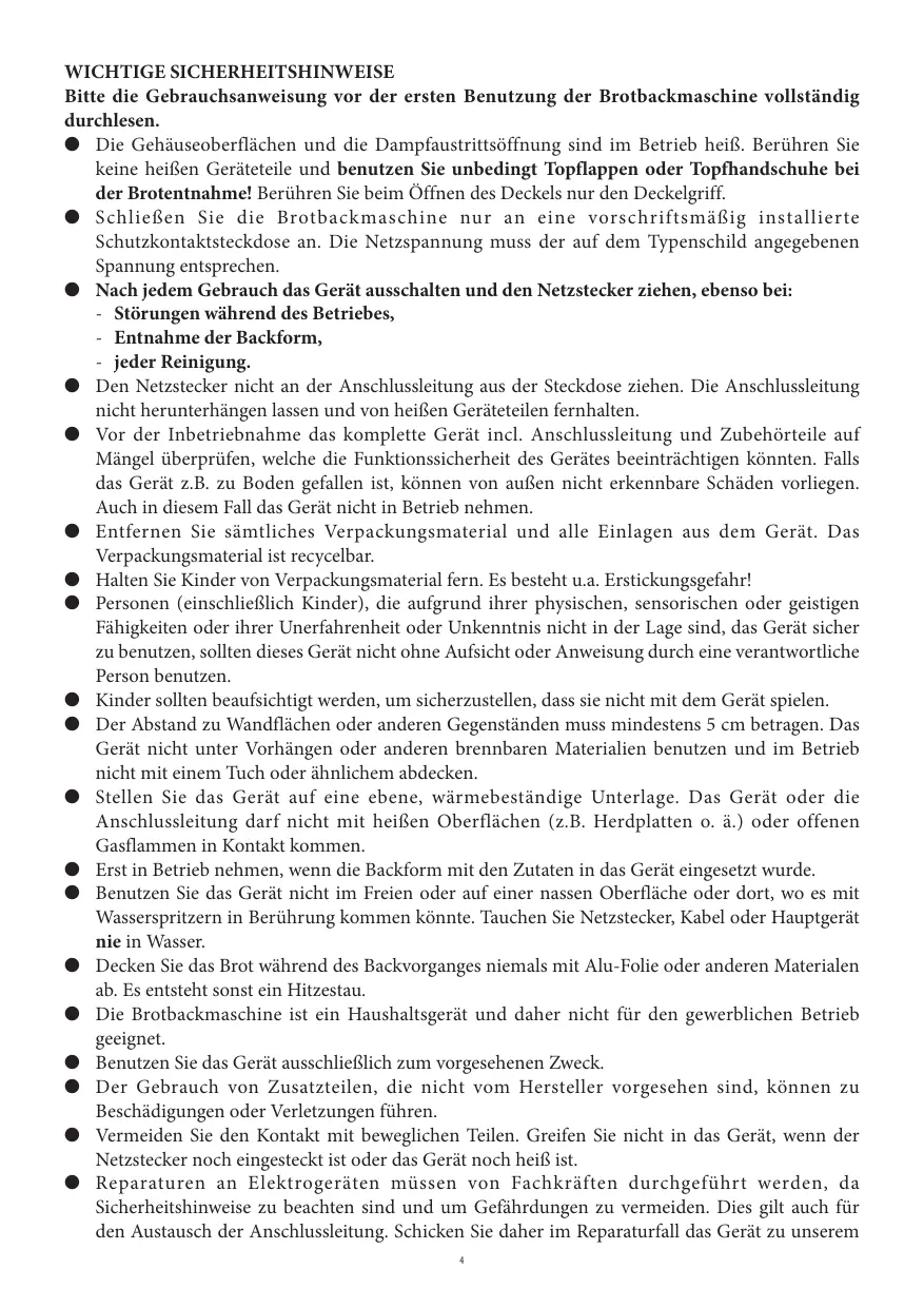 Die Brotbackmaschine ist ein Haushaltsgerät und darauf nicht für den gewerblichen Betrieb geeignet.