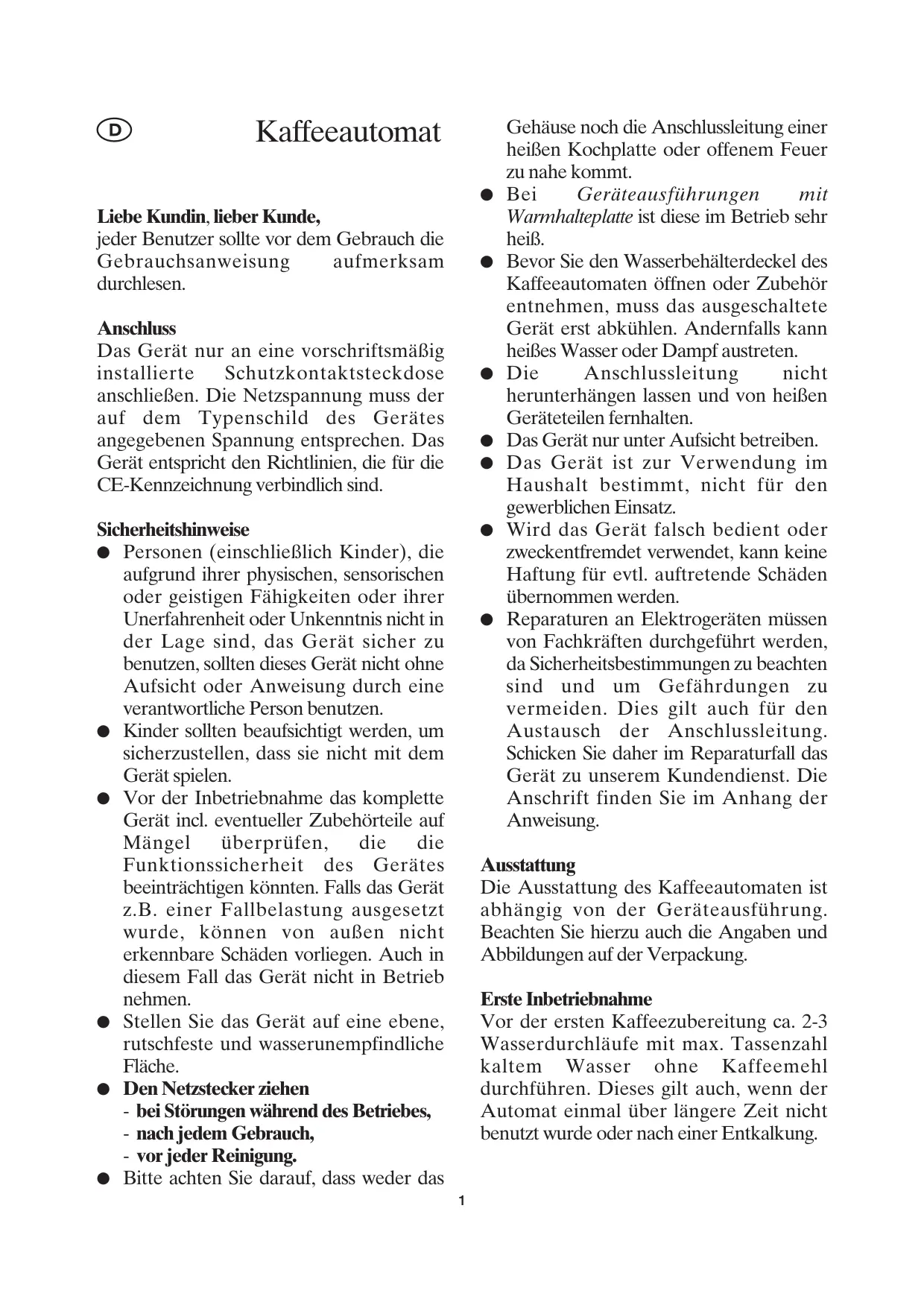 Vor der ersten Kaffeezubereitung ca. 2-3 Wasserdurchläufe mit max. Tassenzahl kaltem Wasser ohne Kaffeemehl durchführen. Dieses gilt auch, wenn der Automat einmal über längere Zeit nicht benutzt wurde oder nach einer Entkalkung.