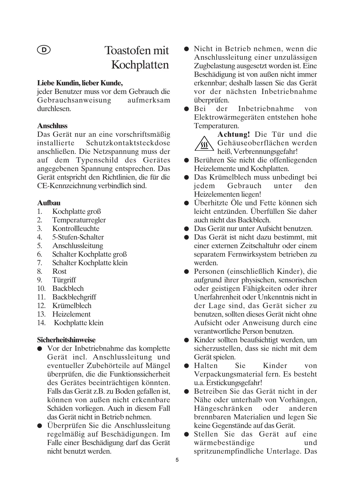 Das Gerät ist nicht dazu bestimmt, mit einer externen Zeitschaltuhr oder einem separatem Fernwirksystem betrieben zu werden. - Personen (einschließlich Kinder), die aufgrund ihrer physischen, sensorischen oder geistigen Fähigkeiten oder ihrer Unerfahrenkeit oder Unkenntnis nicht in der Lage sind, das Gerät sicher zu benutzen, sollen den这点es Gerät nicht ohne Aufsicht oder Anweisung durch eine verantwortliche Person benutzen.