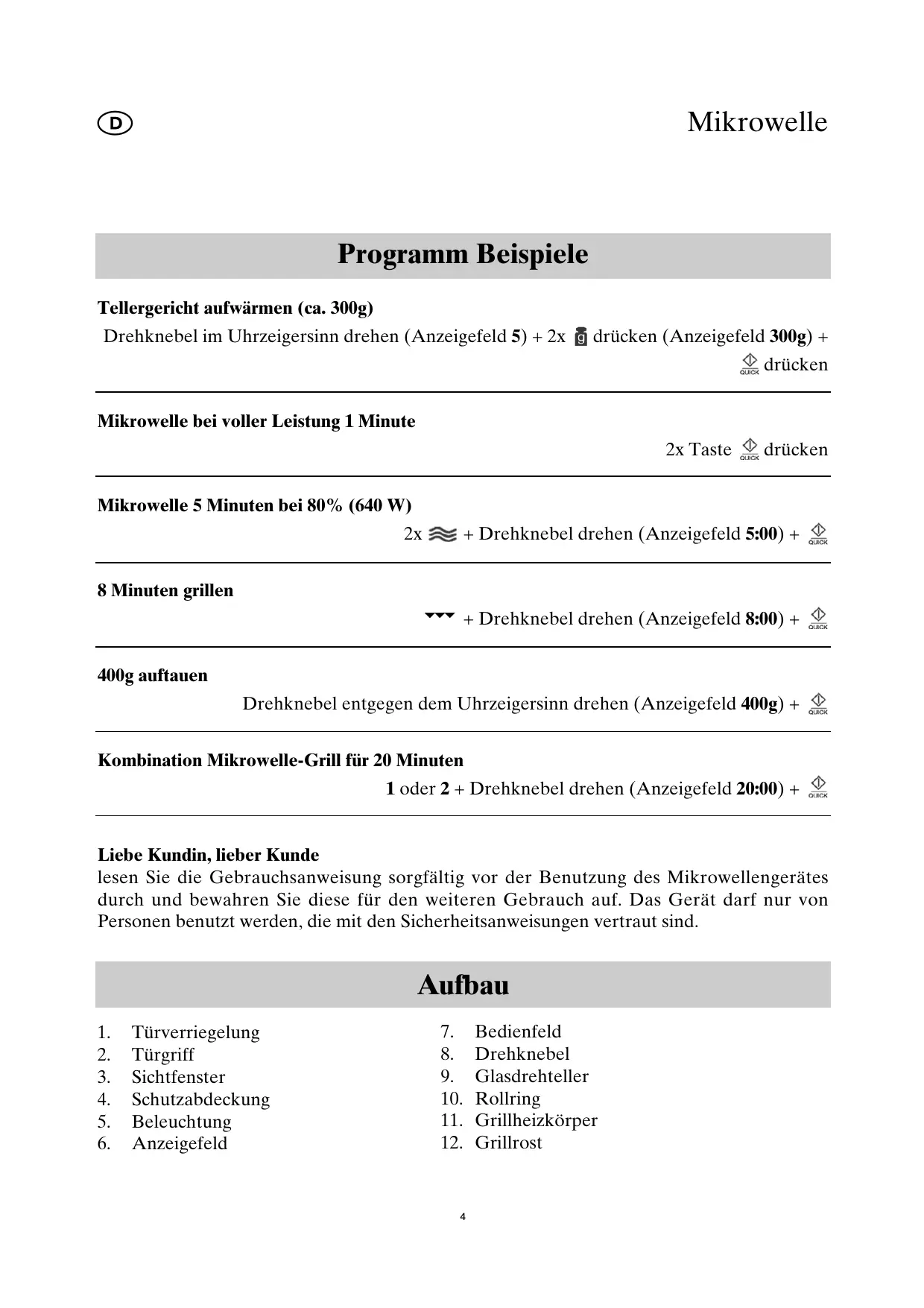 ● Ne retirez pas le film de protection recouvrant l'intérieur de la porte; de même, ne retirez ni l'axe d'entraînement du plateau tournant ni le couvercle de protection (4) de couleur gris/brun à droite à l'intérieur du four, près du dispositif d'éclairage. Repliez les deux pièces d'écartement rectangulaires blanches situées à l'arrière de l'appareil et verrouillez-les. Placez l'anneau de rotation et le plateau tournant en verre dans l'appareil. Avant la première utilisation du four à micro-ondes, laissez-le chauffer 10 minutes environ sur la fonction gril uniquement (sans que la fonction micro-ondes soit activée) afin d'éliminer l'odeur caractéristique qui se dégage lors de la mise en route initiale de tout gril. Une légère fumée peut être dégagée; ceci est normal, mais prévoyez une 27