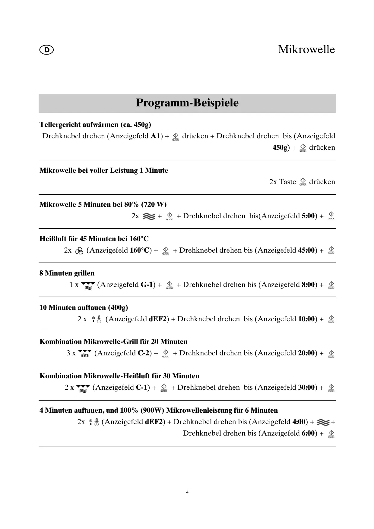 2. Programmez la fonction micro-ondes. 3. Appuyez sur la touche . L'écran affiche les symboles des programmes sélectionnés. 5 bips sonores indiquent la fin de l'ensemble du programme. 39