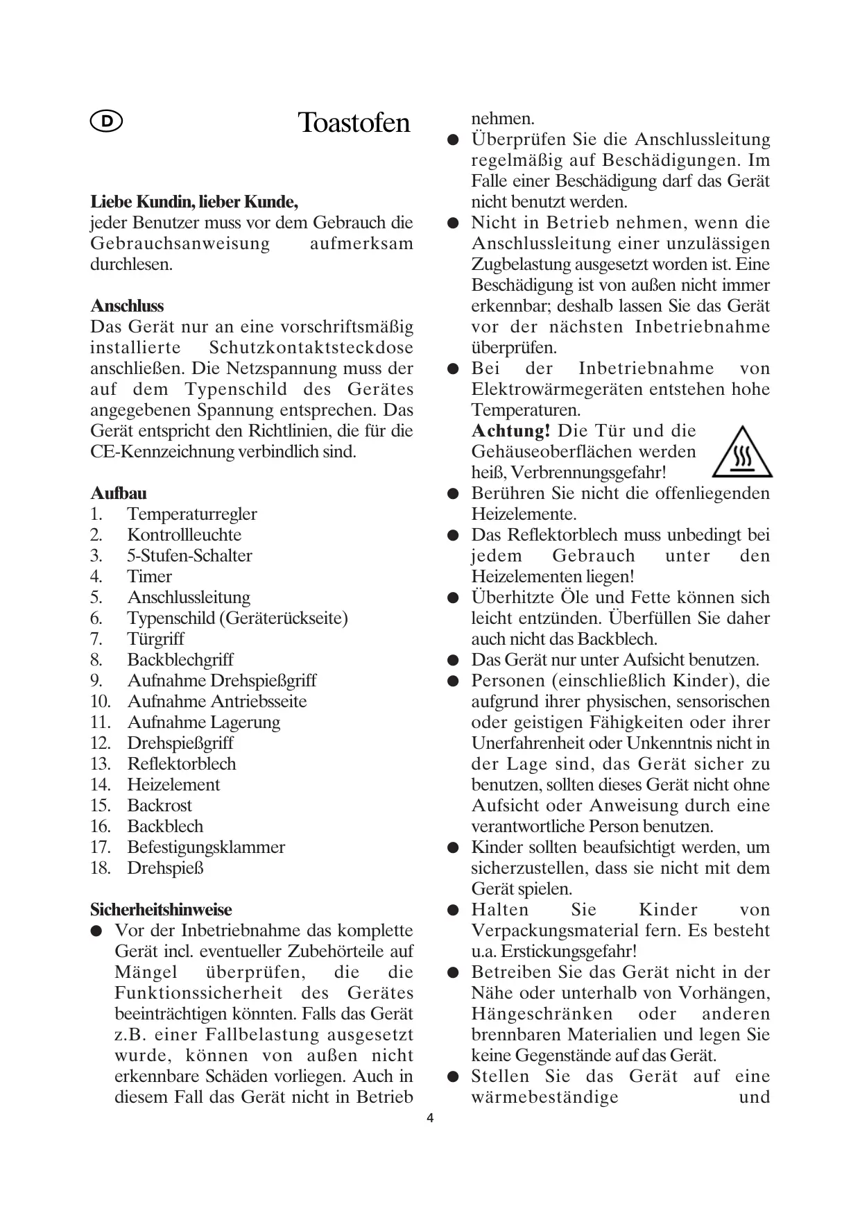 Achtung! Die Tur und die Gehäuseoberflächen werden heiß, Verbrennungsgefahr!