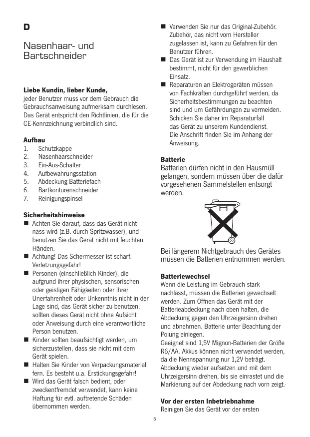 Nasenhaar- und Bartschneider Liebe Kundin, lieber Kunde, jeder Benutzer muss vor dem Gebrauch die Gebrauchsanweisung aufmerksam durchlesen Das Gerât entspricht den Richtinien, die für die CE-Kennzeichnung verbindlich sind. Aufbau Schutzkappe Nasenhaarschneider Ein-Aus-Schalter Aufbewahrungsstation Abdeckung Batteriefach Bartkonturenschneider Reinigungspinsel Sicherheitshinweise M chien Sie darauf, dass das Gerät nicht nass wird (2.8. durch Spritzwasser), und benutzen Sie das Gerät nicht mit feuchten Händen. Achtung! Das Schermesser ist schar. Verletzungsgefahr! Personen (einschlieBlich Kinder), die aufgrund irer physischen, sensorischen oder geistigen Fähigkeiten oder inrer Unerfahrenheit oder Unkennnis nicht in der Lage sind, das Gerät sicher zu benutzen, sollten dieses Gerät nicht ohne Aufsicht oder Anweisung durch eine verantiortiche Person benutzen. Kinder sollten beaufsichtigt werden, um sicherzustellen, dass sie nicht mit dem Gerät spielen Halten Sie Kinder von Verpackungsmaterial fem. Es besteht u.a. Erstickungsgefahr! Wird das Gerät falsch bedient, oder zweckentfremdet verwendet, kann keine Haftung für el. auftretende Schäden übernommen werden: M Verwenden Sie nur das Original-Zubehôr. Zubehôr, das nicht vom Hersteller zugelassen ist, kann zu Gefahren für den Benutzer führen. Das Gerät ist zur Verwendung im Haushalt bestimmt, nicht für den gewerblichen Einsat. Reparaturen an Elektrogeräten müssen von Fachkräften durchgeführt werden, da Sicherheitsbestimmungen zu beachten Sind und um Gefahrdungen zu vermeiden. Schicken Sie daher im Reparaturfall das Gerät zu unserem Kundendienst. Die Anschrftfinden Sie im Anhang der Anweisung. Batteri Batterien dürfen nicht in den Hausmül gelangen, sondem müssen über die dafür vorgesehenen Sammelstellen entsorgt werden. Bei längerem Nichtgebrauch des Gerätes miüssen die Bafterien entnommen werden. Batteriewechsel Wenn die Leistung im Gebrauch stark nachlässt, müssen die Batterien gewechselt werden. Zum Offnen das Gerät mit der Batterieabdeckung nach oben halten, die Abdeckung gegen den Unrzeigersinn drehen und abnehmen. Batterie unter Beachtung der Polung einlegen. Geeignet sind 1,5V Mignon-Batterien der GrôBe R6/AA. Akkus Kônnen nicht verwendet werden, da die Nennspannung nur 1,2V beträgt Abdeckung wieder aufsetzen und mit dem Uhrzeigersinn drehen, bis sie einrastet und die Markierung auf der Abdeckung nach von zeigt. Vor der ersten Inbetriebnahme Reinigen Sie das Gerat vor der ersten