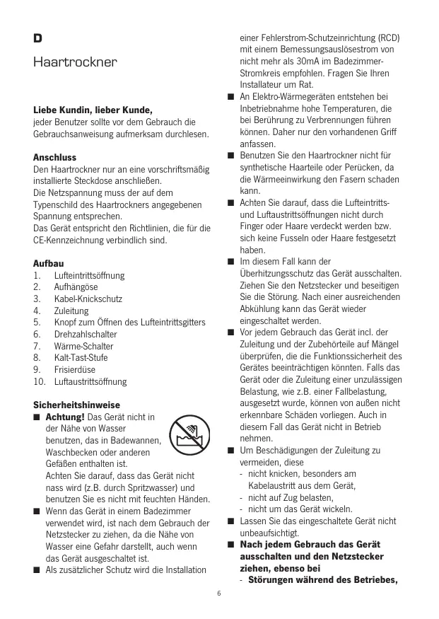 powminmewnr der Nähe von Wasser benutzen, das in Badewannen, Waschbecken oder anderen Gefäben enthalten ist. Achten Sie darauf, dass das Gerät nicht nass wird (2.B. durch Spritawasser) und benutzen Sie es nicht mit feuchten Händen 1 \enn das Gerät in einem Badezimmer vervendet wird, ist nach dem Gebrauch der Netzstecker zu ziehen, da die Nähe von Wasser eine Gefahr darstell, auch wenn das Gerät ausgeschaltet ist Als zusätzlicher Schutz wird die Installation einer Fehlerstrom-Schutzeinrichtung (RCD) mit einem Bemessungsauslésestrom von nicht mehr als 30mA im Badezimmer- Stromkreis empfohlen. Fragen Sie Ihren installateur um Rat An ElektroWärmegeräten entstehen bei Inbetriebnahme hohe Temperaturen, die bei Berührung zu Verbrennungen führen Kônnen. Daher nur den vorhandenen Griff anfassen. Benutzen Sie den Haartrockner nicht für ssnthetische Haarteile oder Perücken, da die Wärmeeinwirkung den Fasern schaden kann. Achten Sie darauf, dass die Lufteintrits- und Luftaustrittsofinungen nicht durch Finger oder Haare verdeckt werden bzw. sich keine Fusseln oder Haare festgesetzt haben Im diesem Fall kann der Überhitzungsschutz das Gerët ausschalten. Ziehen Sie den Netzstecker und beseitigen Sie die Stôrung. Nach einer ausreichenden Abkühlung kann das Gerät wieder eingeschaltet werden Vor iedem Gebrauch das Gerät incl. der Zuletung und der Zubehôreile auf Mängel überprüfen, die die Funktionssicherheit des Gerètes beeinträchtigen konnten. Falls das Gerät oder die Zuletung einer unzulässigen Belastung, wie z.B. einer Fallbelastung, ausgesetzt wurde, Konnen von auêen nicht erkennbare Schäden vorliegen. Auch in diesem Fall das Gerèt nicht in Betrieb nehmen Um Beschädigungen der Zuleitung zu vermeiden, diese = nicht knicken, besonders am Kabelaustrit aus dem Gerät, nicht auf Zug belasten, nicht um das Gerät wickeln. Lassen Sie das eingeschaltete Gerät nicht unbeautsichtigt Nach jedem Gebrauch das Gerät ausschalten und den Netzstecker ziehen, ebenso bei rungen während des Betriebes,